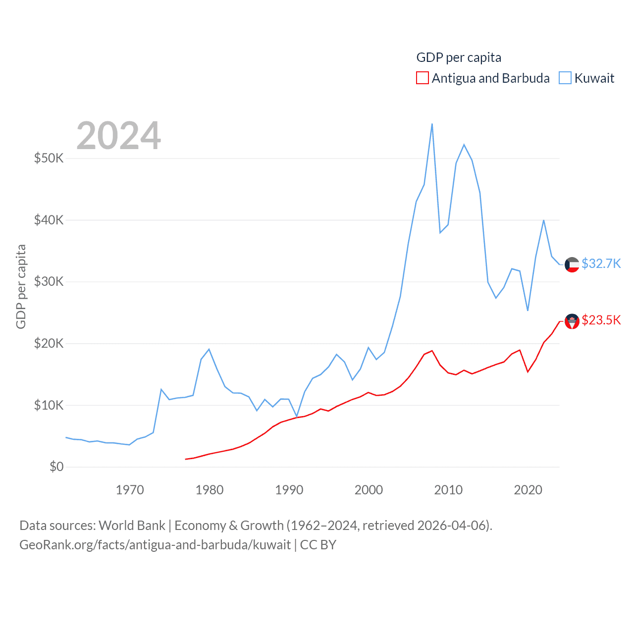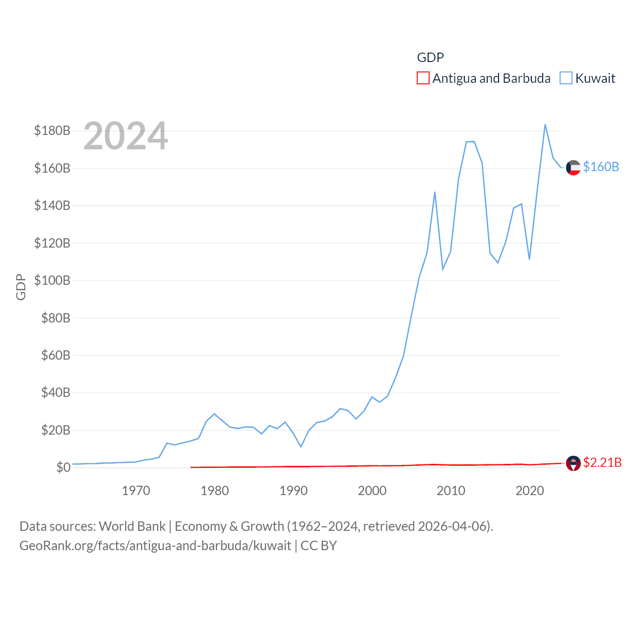 By GDP, Antigua and Barbuda ranks 177/197 ($2.21B) and Kuwait ranks 59/197 ($160B). By GDP per capita, Antigua and Barbuda ranks 53/197 ($23,542), while Kuwait ranks 37/197 ($32,718).