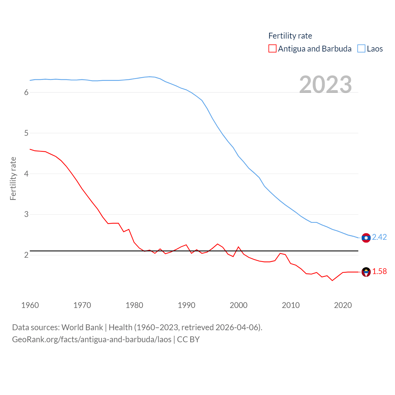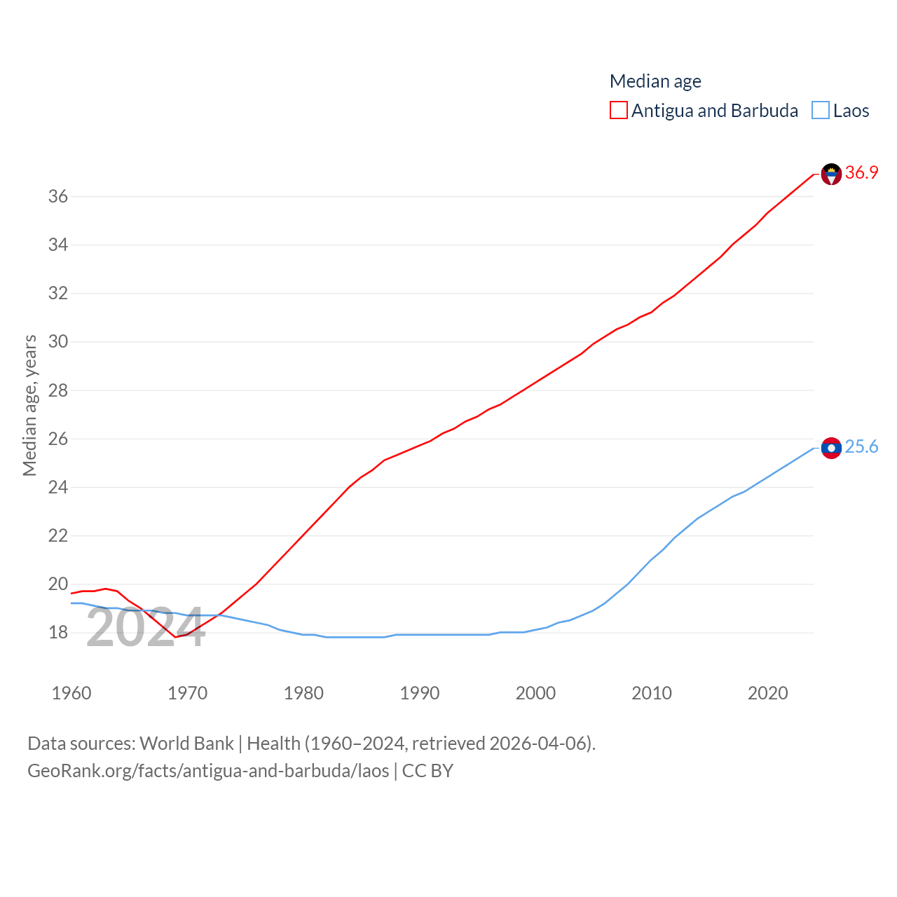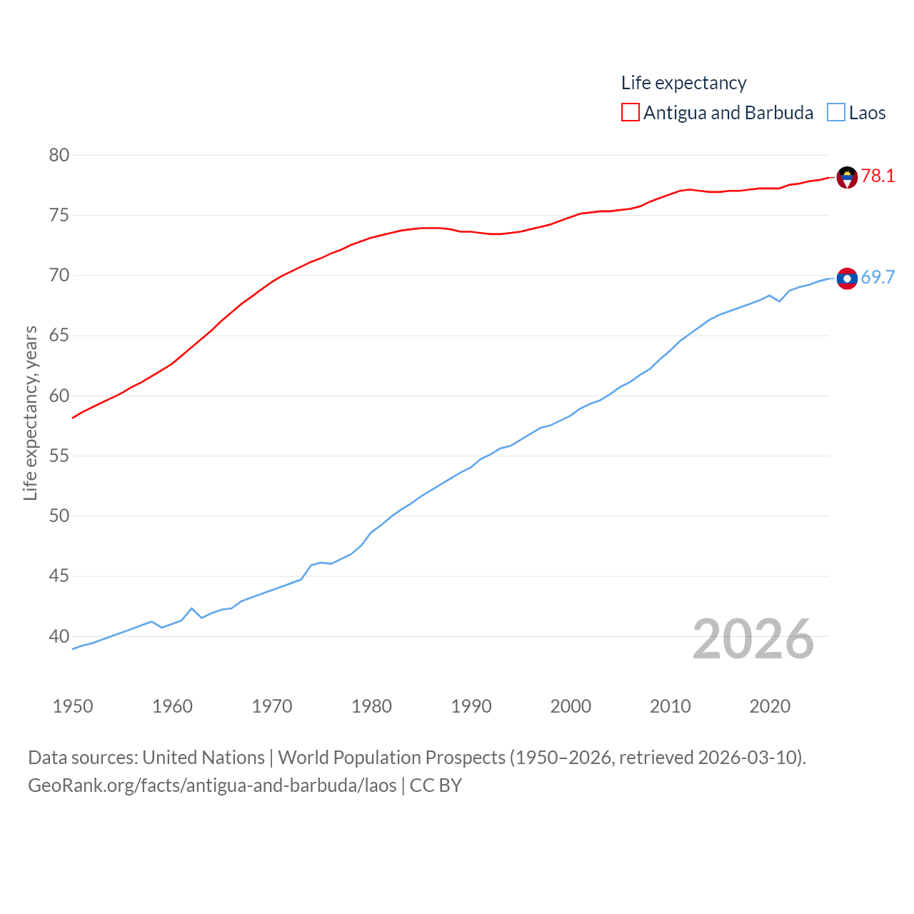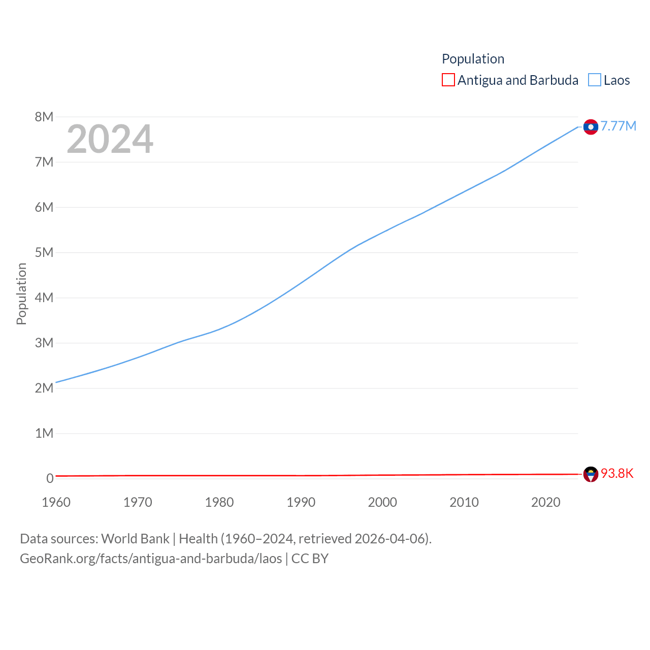 Antigua and Barbuda has a population of 93.8K (ranked 185/197), compared with 7.77M in Laos (ranked 103/197). Antigua and Barbuda's land area is 169.9 sq mi versus 89,112 sq mi for Laos (ranked 183rd vs. 79th).