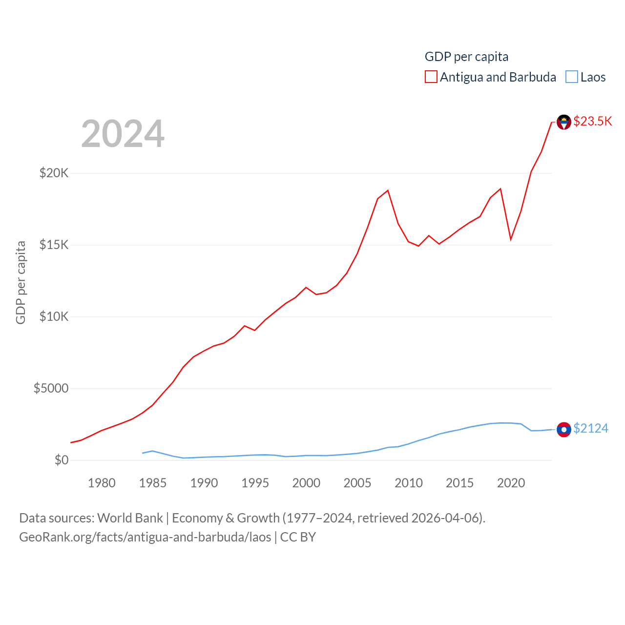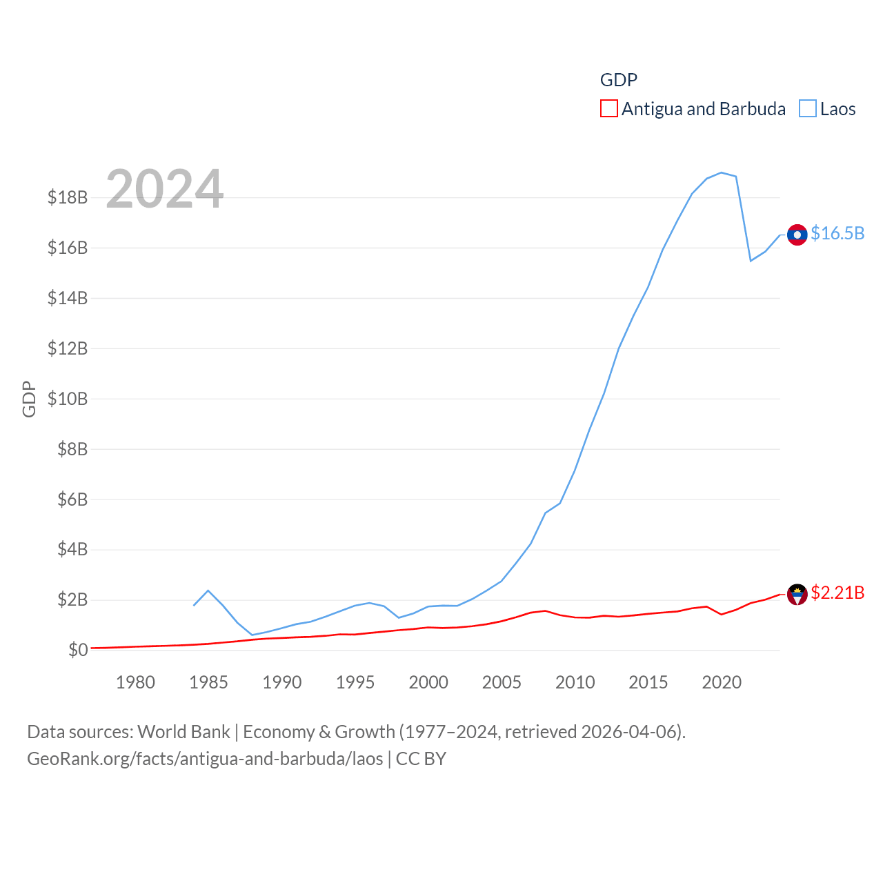 By GDP, Antigua and Barbuda ranks 177/197 ($2.21B) and Laos ranks 139/197 ($16.5B). By GDP per capita, Antigua and Barbuda ranks 53/197 ($23,542), while Laos ranks 155/197 ($2,124).