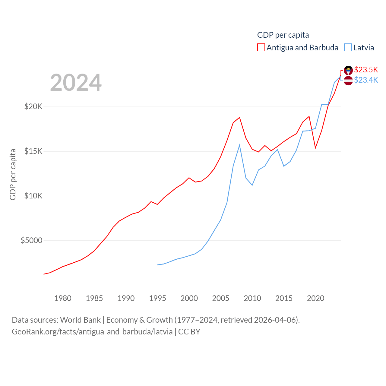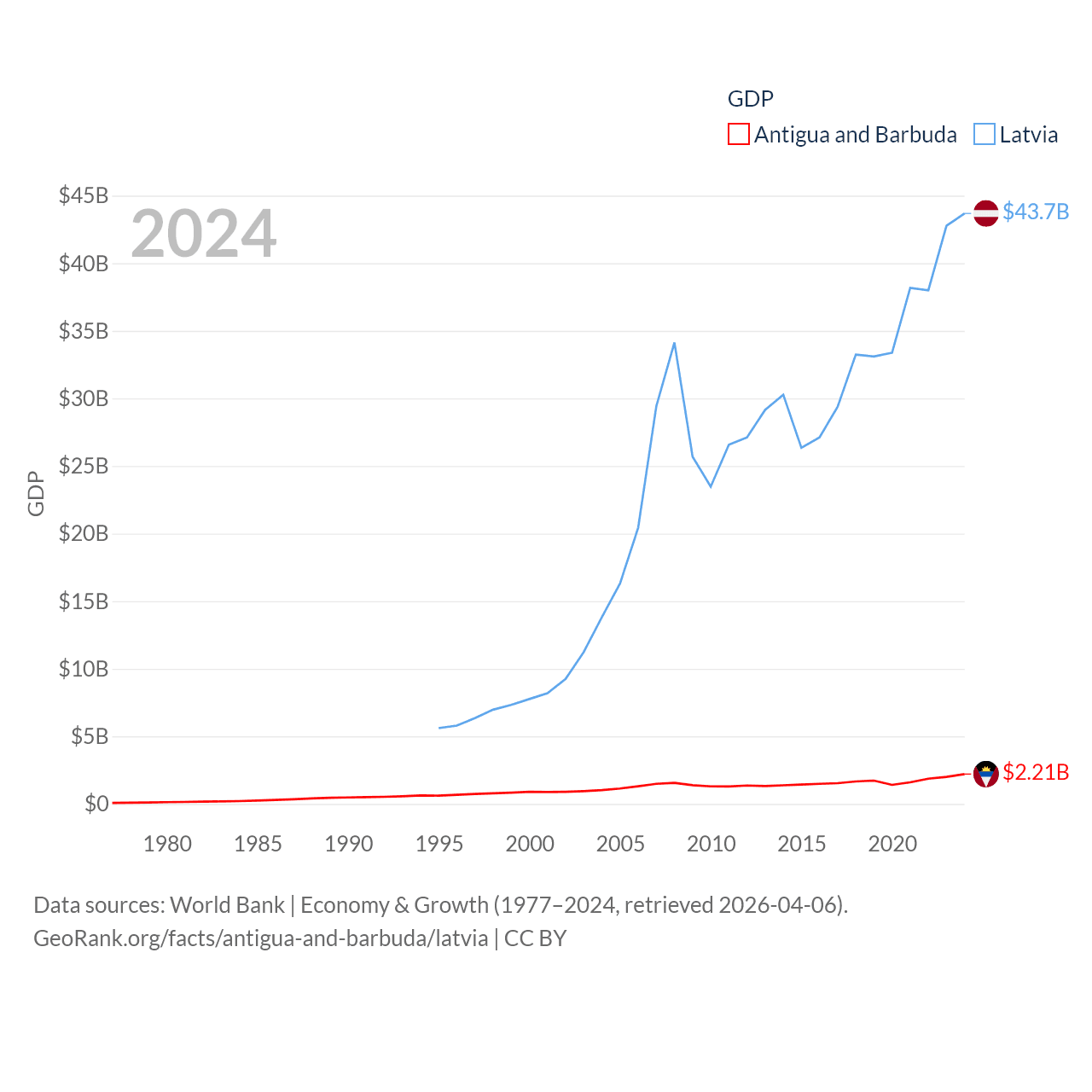 By GDP, Antigua and Barbuda ranks 177/197 ($2.21B) and Latvia ranks 99/197 ($43.7B). By GDP per capita, Antigua and Barbuda ranks 53/197 ($23,542), while Latvia ranks 54/197 ($23,409).