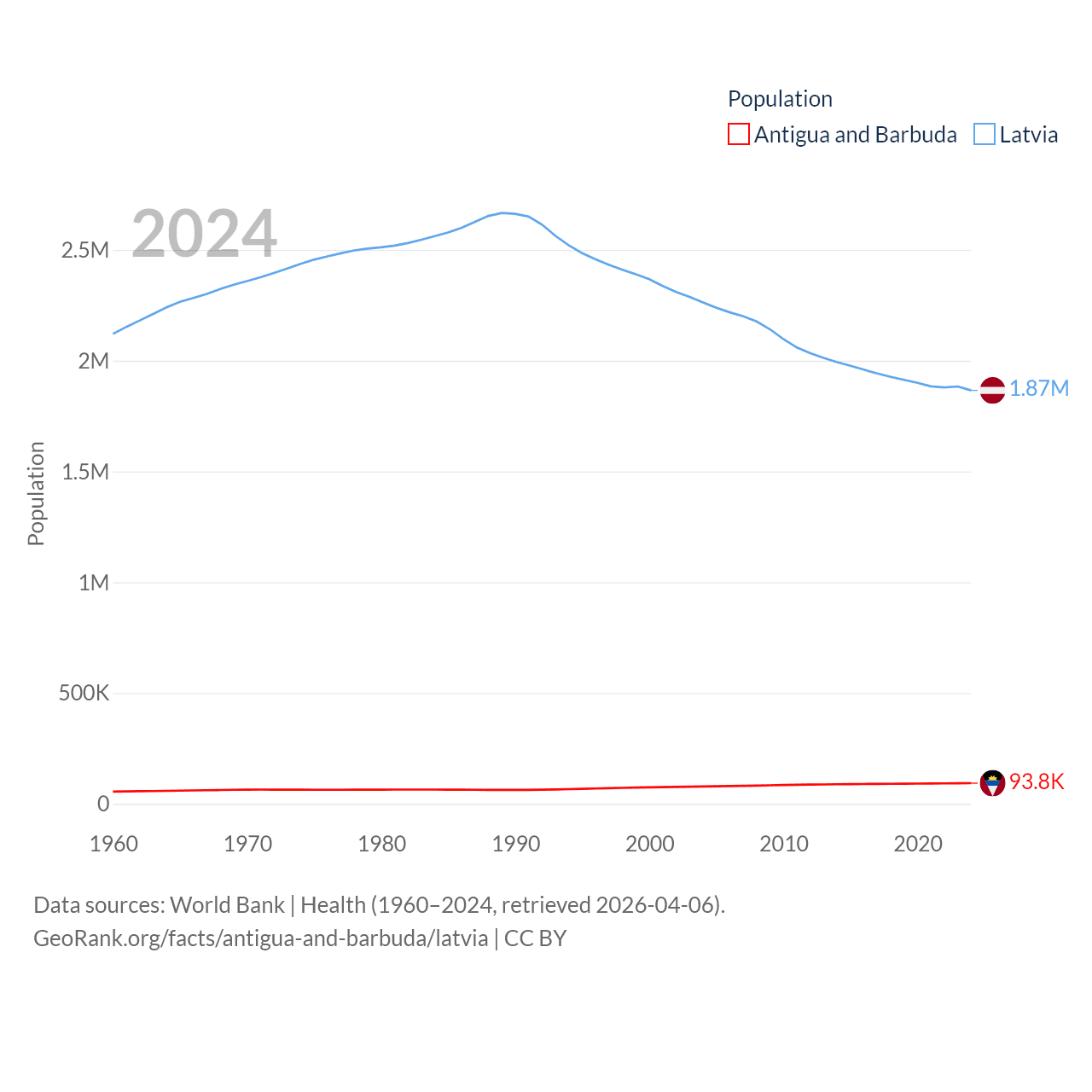 Antigua and Barbuda has a population of 93.8K (ranked 185/197), compared with 1.87M in Latvia (ranked 149/197). Antigua and Barbuda's land area is 169.9 sq mi versus 24,027 sq mi for Latvia (ranked 183rd vs. 121st).