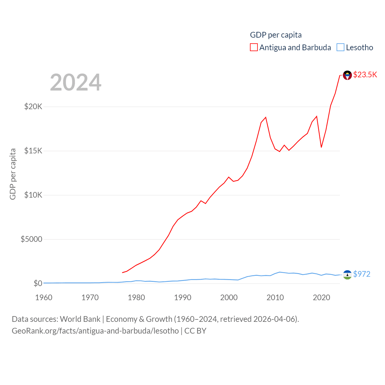 By GDP, Antigua and Barbuda ranks 177/197 ($2.21B) and Lesotho ranks 175/197 ($2.27B). By GDP per capita, Antigua and Barbuda ranks 53/197 ($23,542), while Lesotho ranks 181/197 ($972).