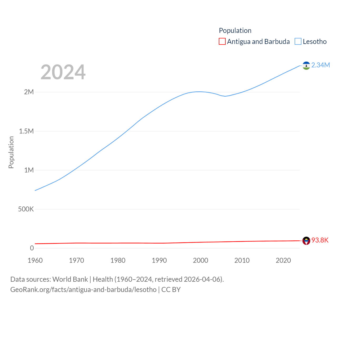 Antigua and Barbuda has a population of 93.8K (ranked 185/197), compared with 2.34M in Lesotho (ranked 145/197). Antigua and Barbuda's land area is 169.9 sq mi versus 11,722 sq mi for Lesotho (ranked 183rd vs. 137th).
