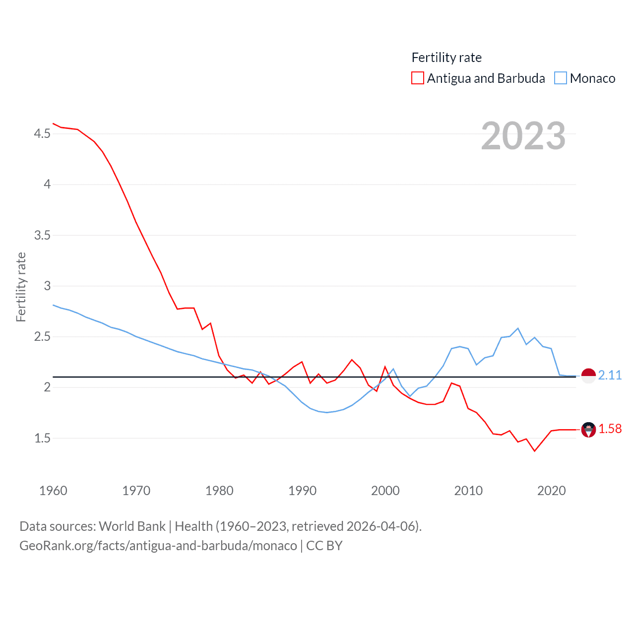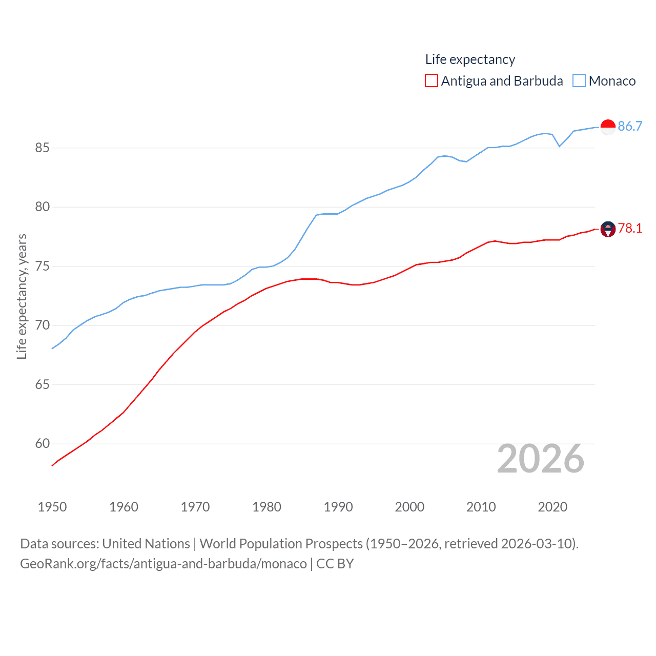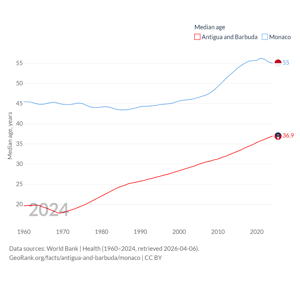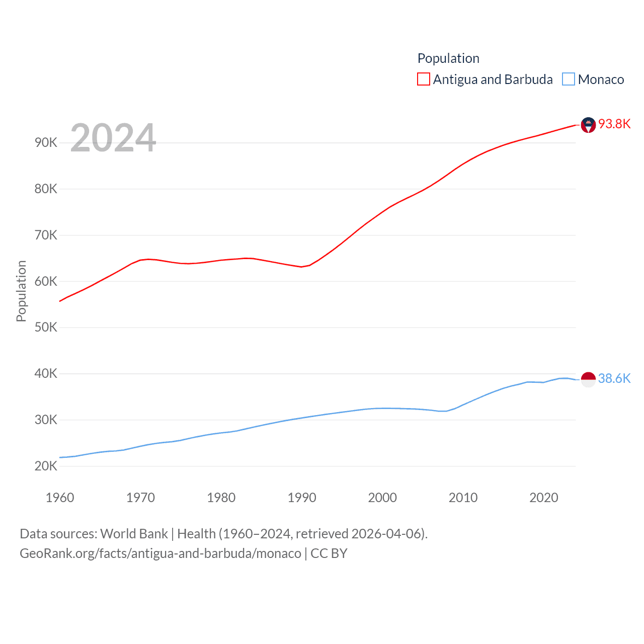 Antigua and Barbuda has a population of 93.8K (ranked 185/197), compared with 38.6K in Monaco (ranked 191/197). Antigua and Barbuda's land area is 169.9 sq mi versus 0.8 sq mi for Monaco (ranked 183rd vs. 196th).