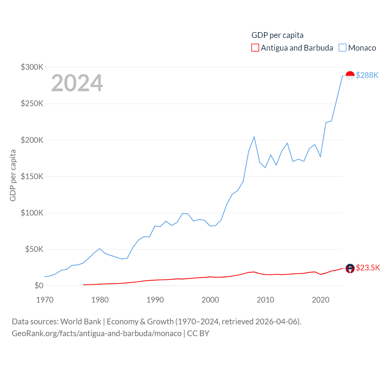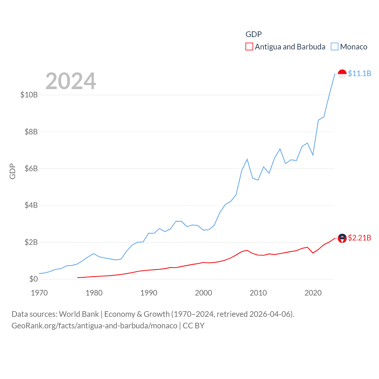 By GDP, Antigua and Barbuda ranks 177/197 ($2.21B) and Monaco ranks 152/197 ($11.1B). By GDP per capita, Antigua and Barbuda ranks 53/197 ($23,542), while Monaco ranks 1/197 ($288,001).