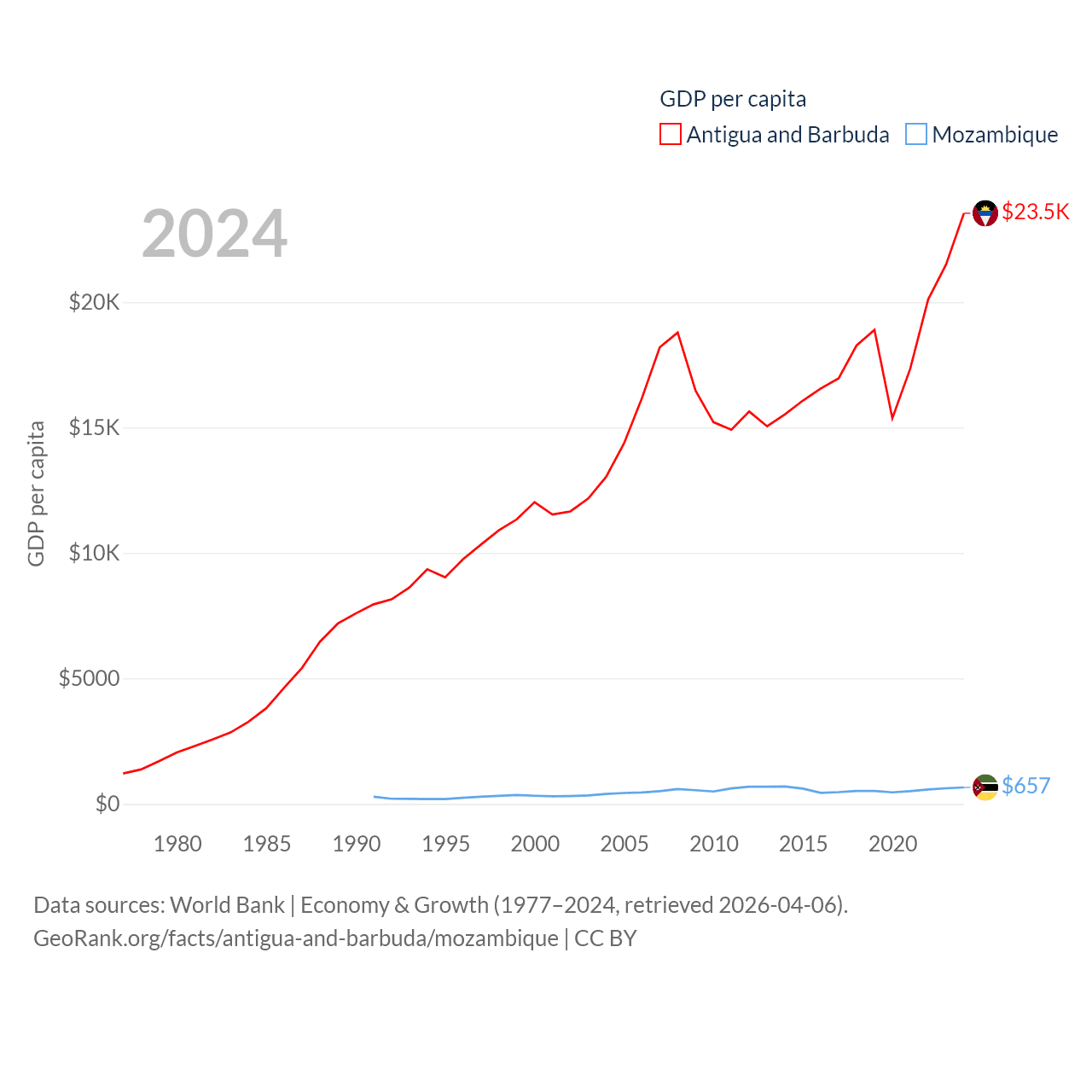 By GDP, Antigua and Barbuda ranks 177/197 ($2.21B) and Mozambique ranks 123/197 ($22.7B). By GDP per capita, Antigua and Barbuda ranks 53/197 ($23,542), while Mozambique ranks 189/197 ($657).