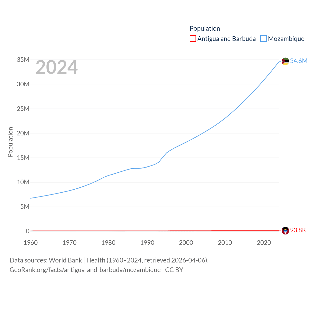 Antigua and Barbuda has a population of 93.8K (ranked 185/197), compared with 34.6M in Mozambique (ranked 46/197). Antigua and Barbuda's land area is 169.9 sq mi versus 303,623 sq mi for Mozambique (ranked 183rd vs. 34th).