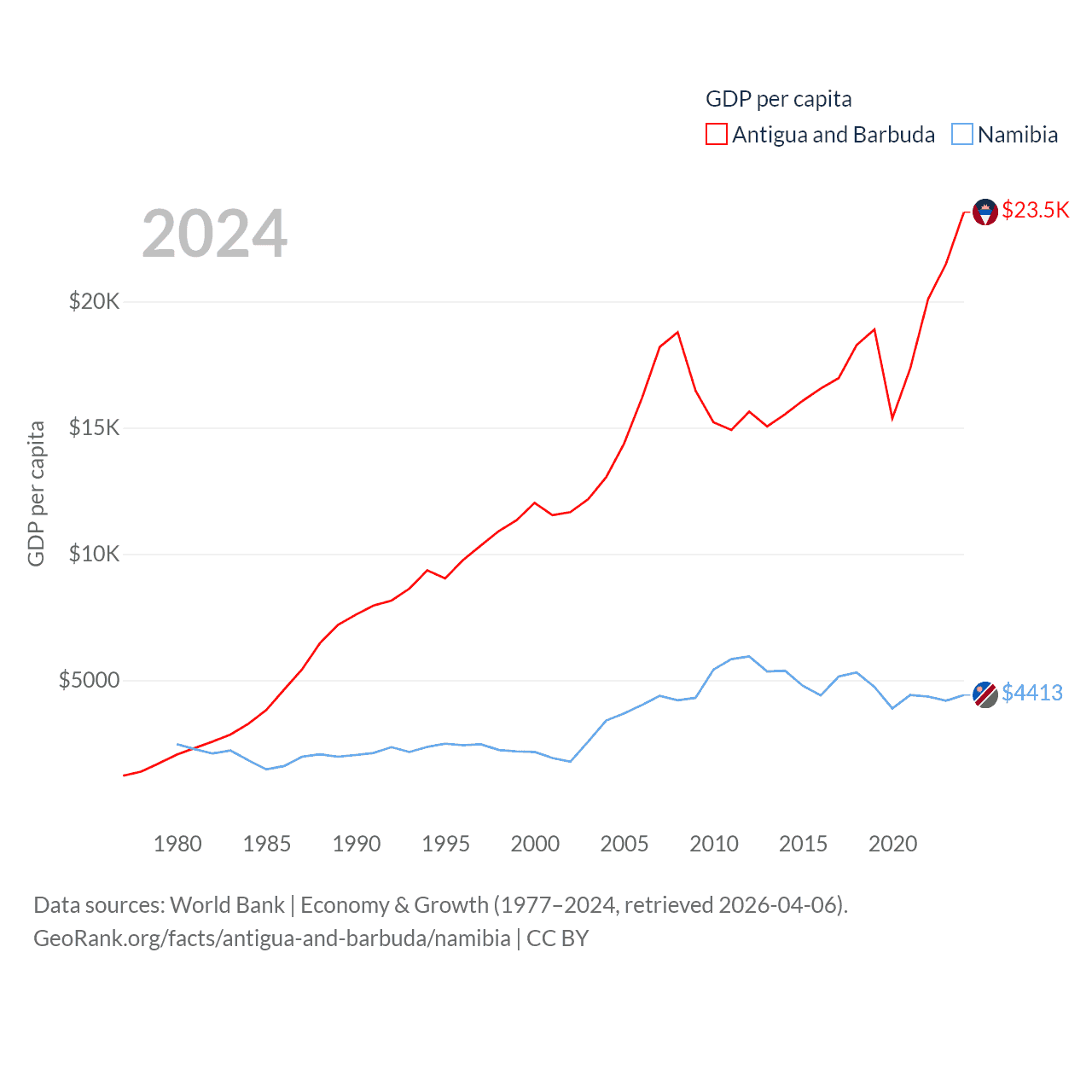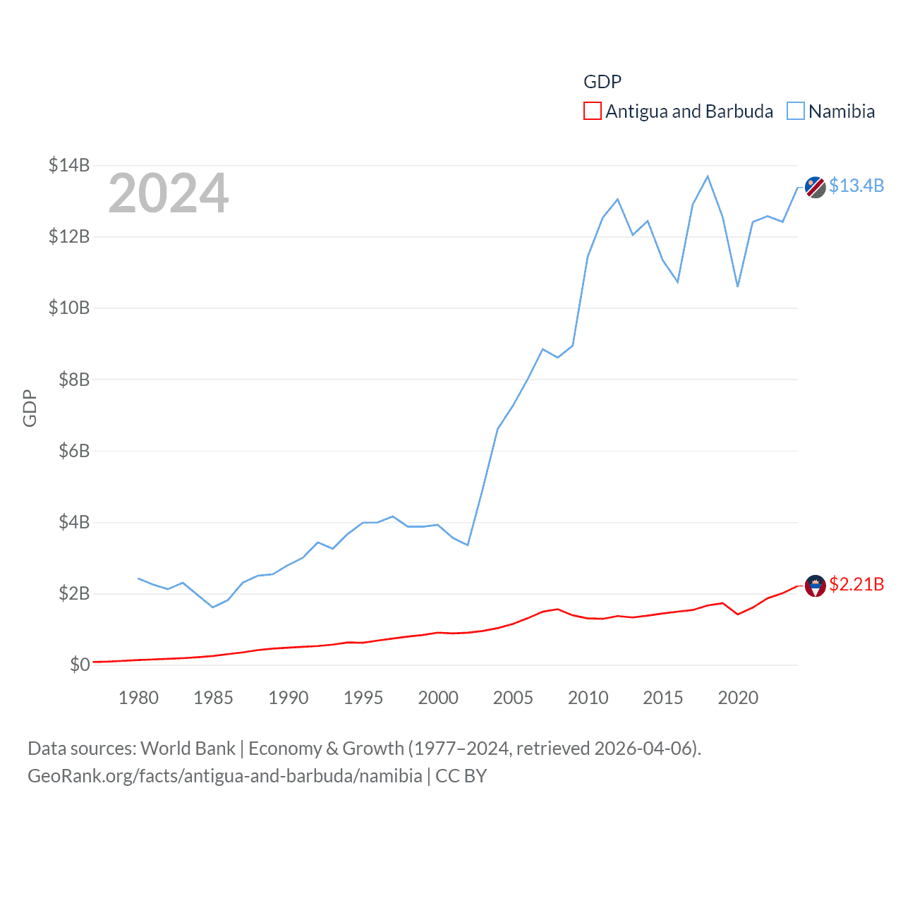 By GDP, Antigua and Barbuda ranks 177/197 ($2.21B) and Namibia ranks 147/197 ($13.4B). By GDP per capita, Antigua and Barbuda ranks 53/197 ($23,542), while Namibia ranks 126/197 ($4,413).