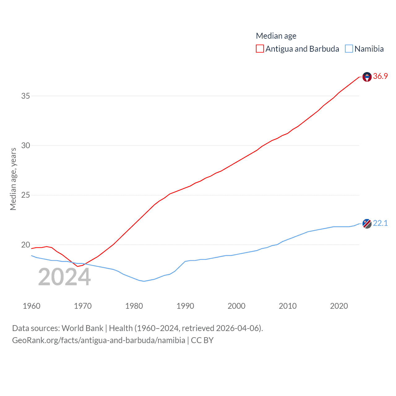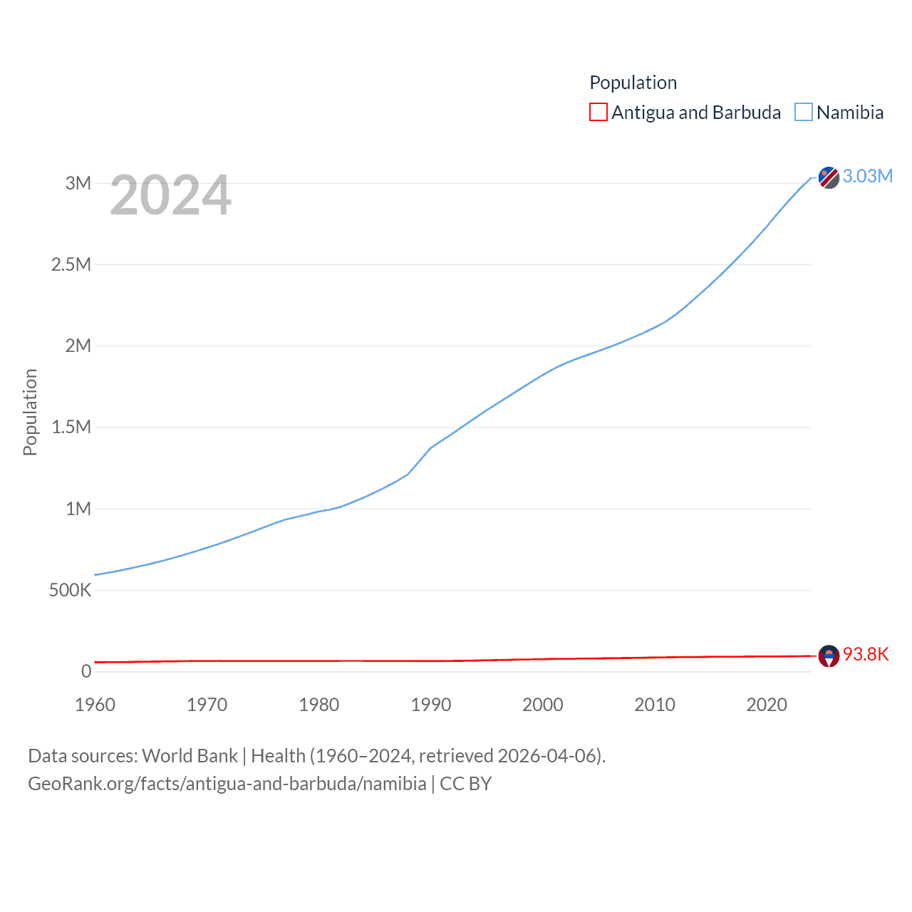 Antigua and Barbuda has a population of 93.8K (ranked 185/197), compared with 3.03M in Namibia (ranked 136/197). Antigua and Barbuda's land area is 169.9 sq mi versus 317,874 sq mi for Namibia (ranked 183rd vs. 33rd).