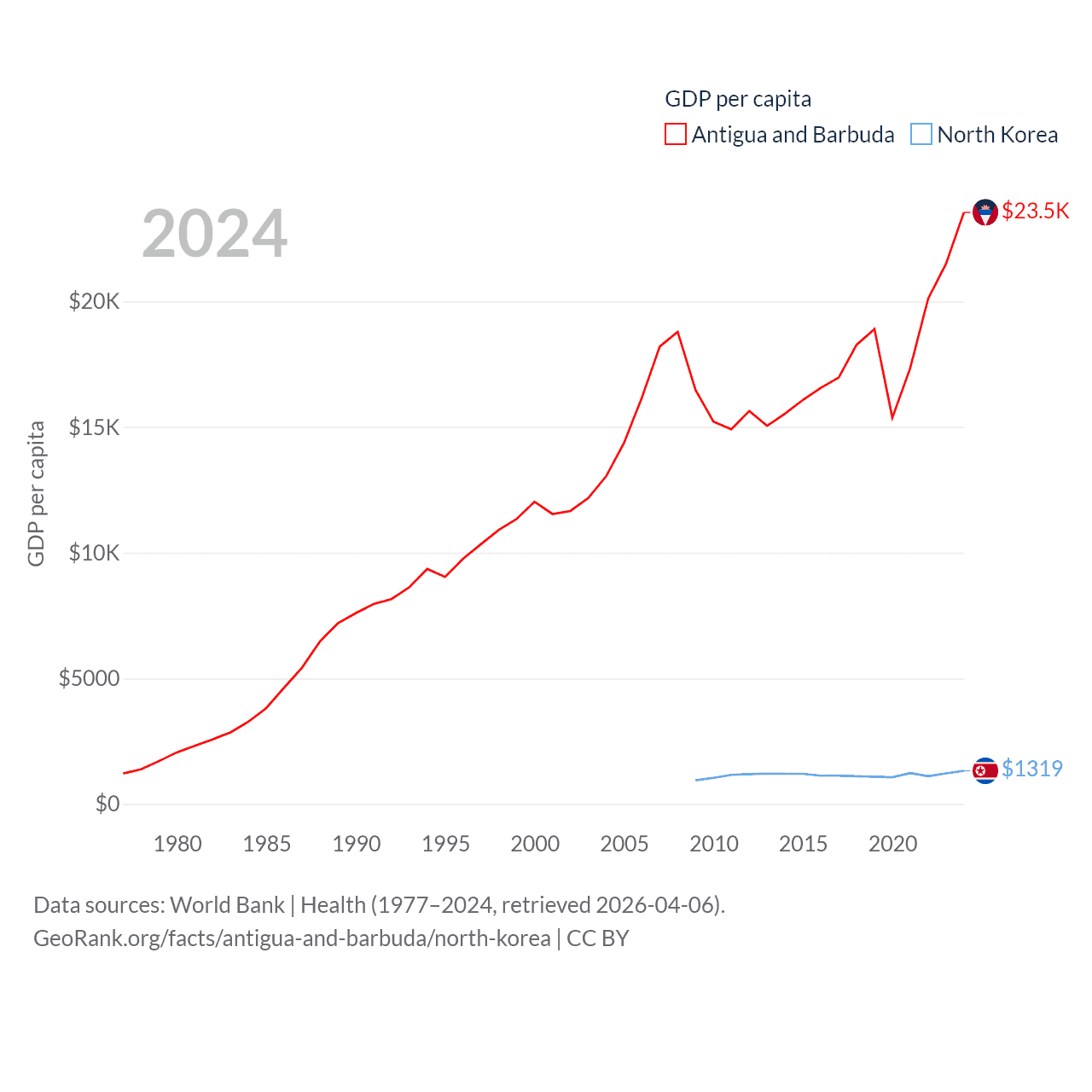 By GDP, Antigua and Barbuda ranks 177/197 ($2.21B) and North Korea ranks 106/197 ($34.9B). By GDP per capita, Antigua and Barbuda ranks 53/197 ($23,542), while North Korea ranks 168/197 ($1,319).