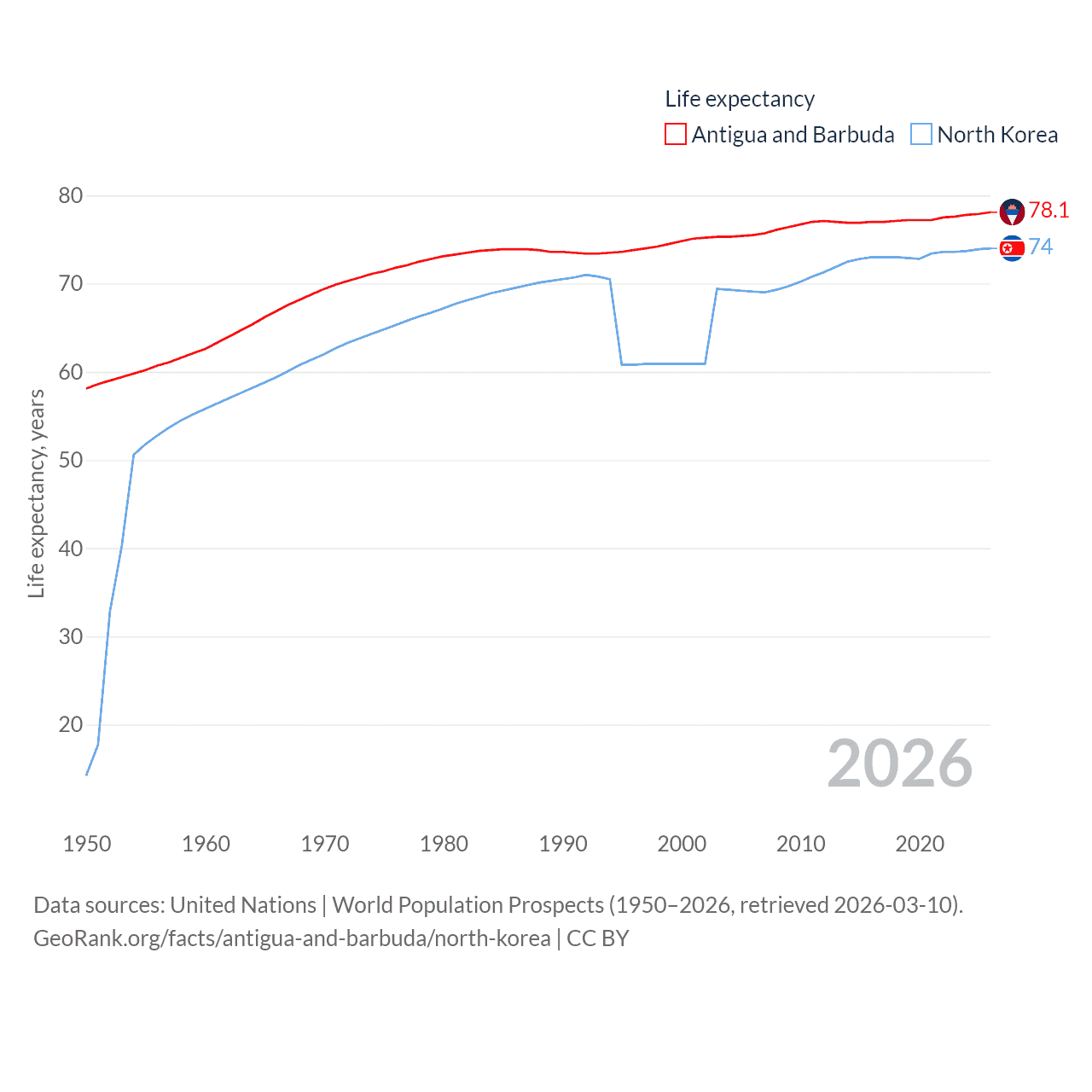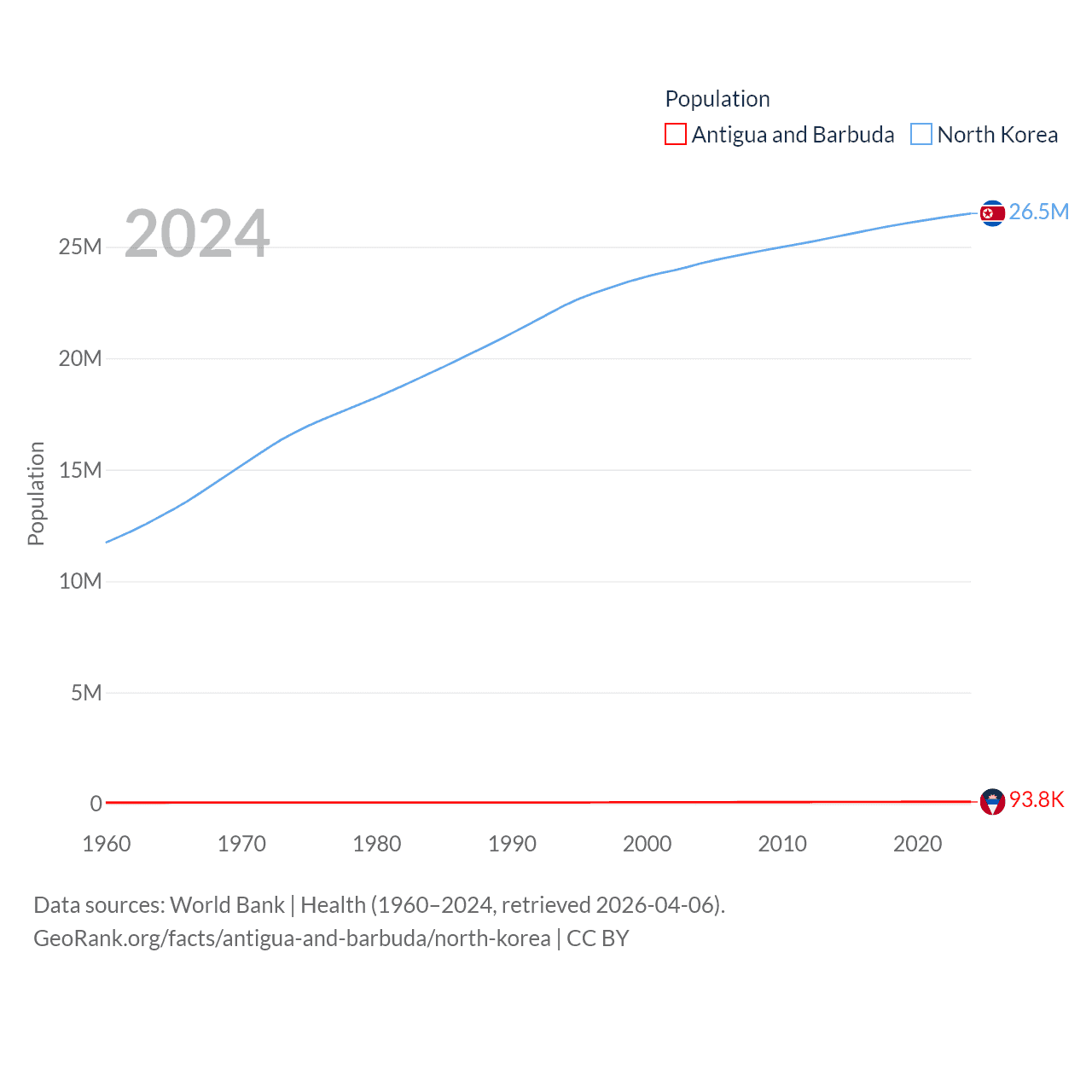 Antigua and Barbuda has a population of 93.8K (ranked 185/197), compared with 26.5M in North Korea (ranked 56/197). Antigua and Barbuda's land area is 169.9 sq mi versus 46,491 sq mi for North Korea (ranked 183rd vs. 97th).