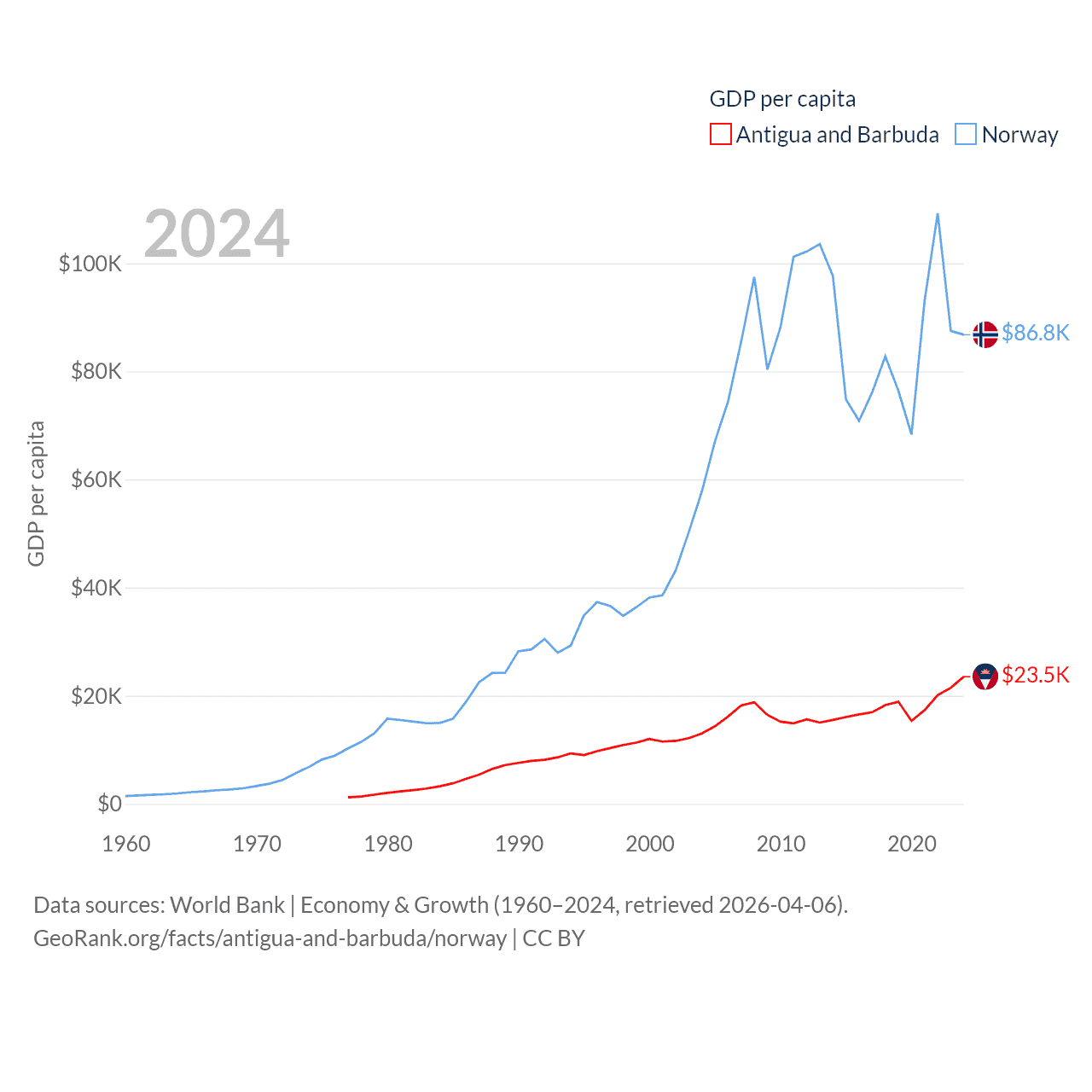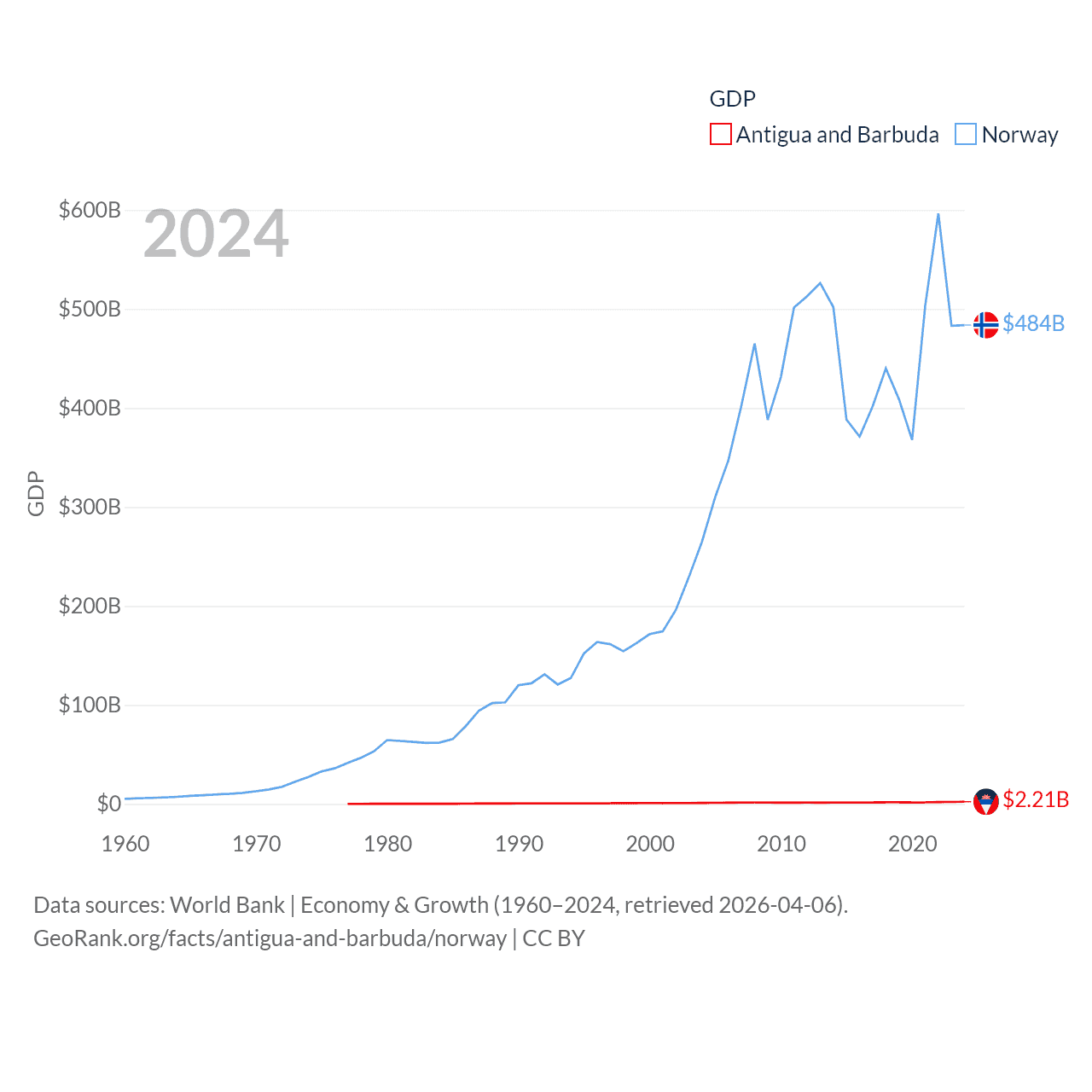 By GDP, Antigua and Barbuda ranks 177/197 ($2.21B) and Norway ranks 32/197 ($484B). By GDP per capita, Antigua and Barbuda ranks 53/197 ($23,542), while Norway ranks 8/197 ($86,785).