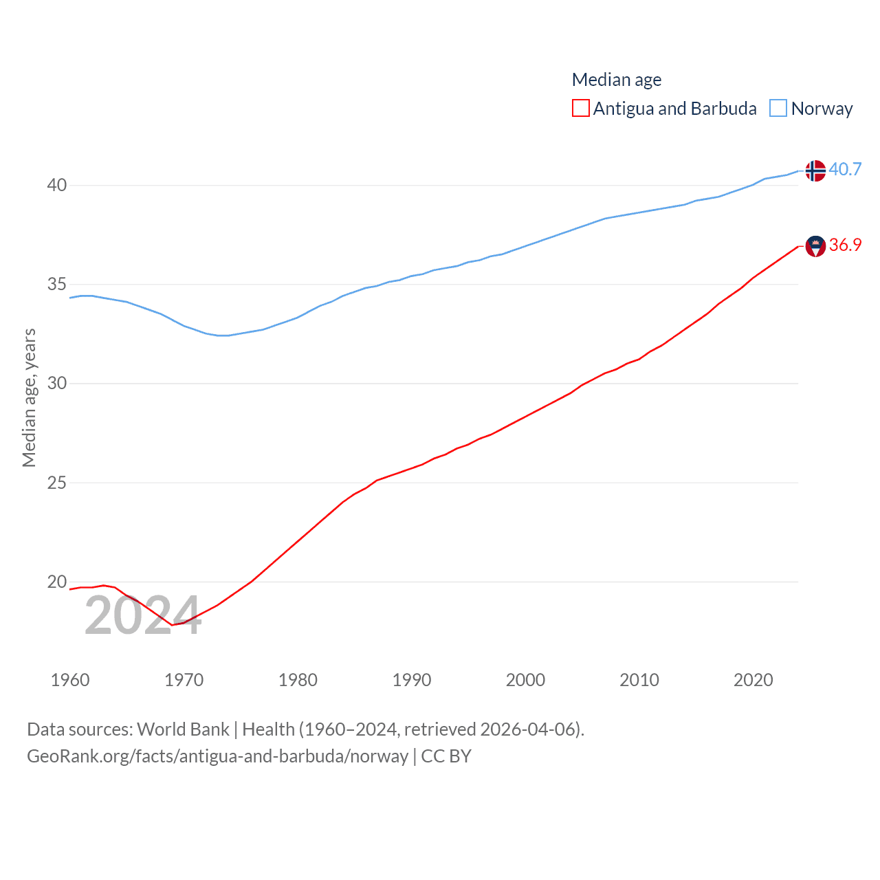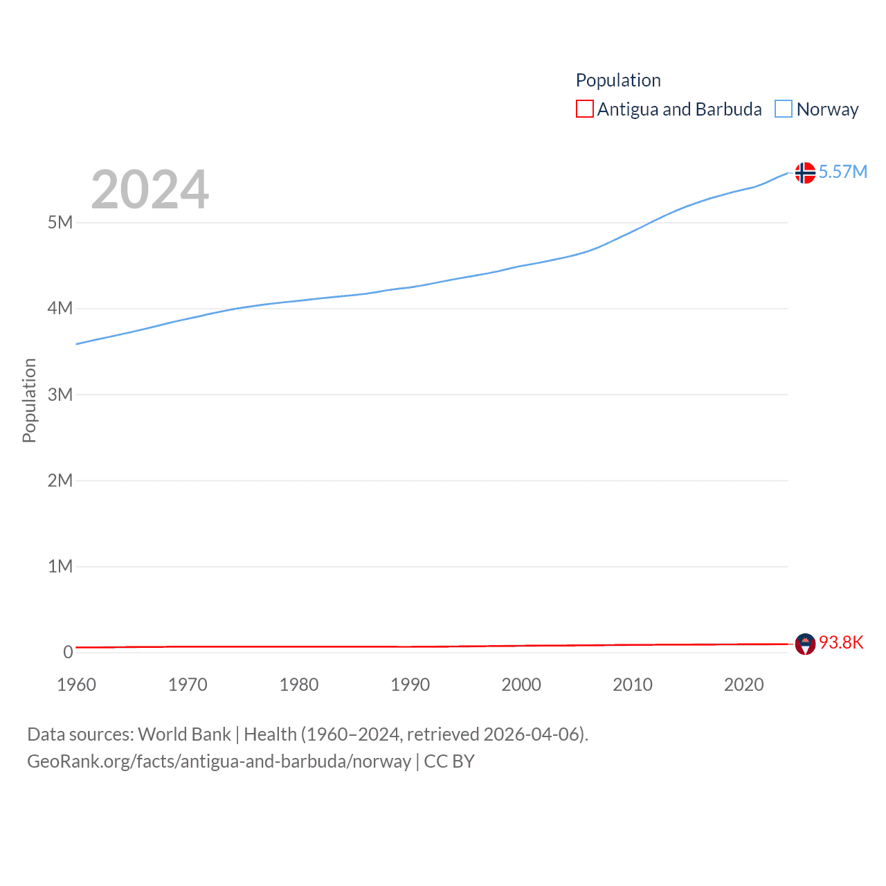 Antigua and Barbuda has a population of 93.8K (ranked 185/197), compared with 5.57M in Norway (ranked 118/197). Antigua and Barbuda's land area is 169.9 sq mi versus 140,645 sq mi for Norway (ranked 183rd vs. 62nd).