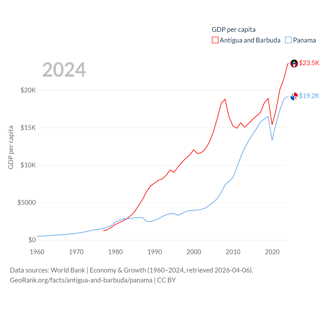 By GDP, Antigua and Barbuda ranks 177/197 ($2.21B) and Panama ranks 78/197 ($86.5B). By GDP per capita, Antigua and Barbuda ranks 53/197 ($23,542), while Panama ranks 60/197 ($19,161).
