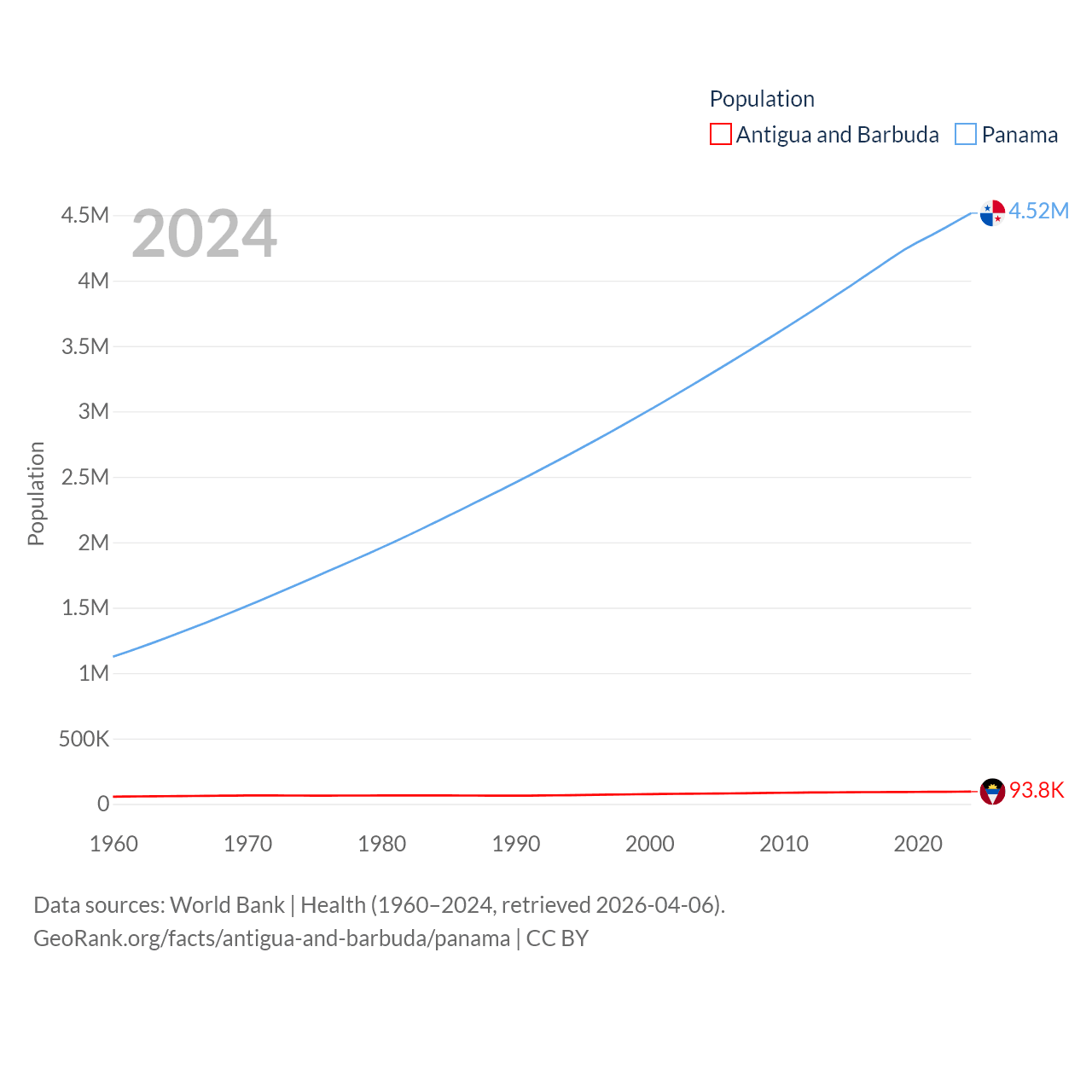Antigua and Barbuda has a population of 93.8K (ranked 185/197), compared with 4.52M in Panama (ranked 128/197). Antigua and Barbuda's land area is 169.9 sq mi versus 28,641 sq mi for Panama (ranked 183rd vs. 115th).