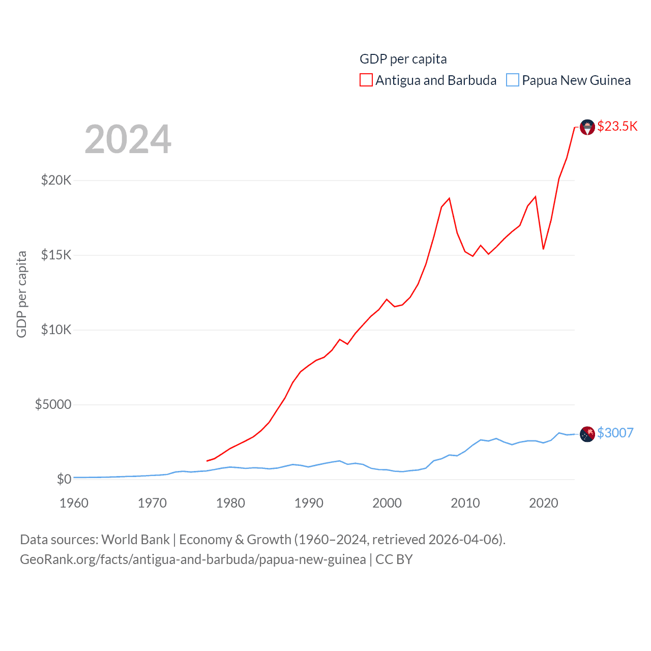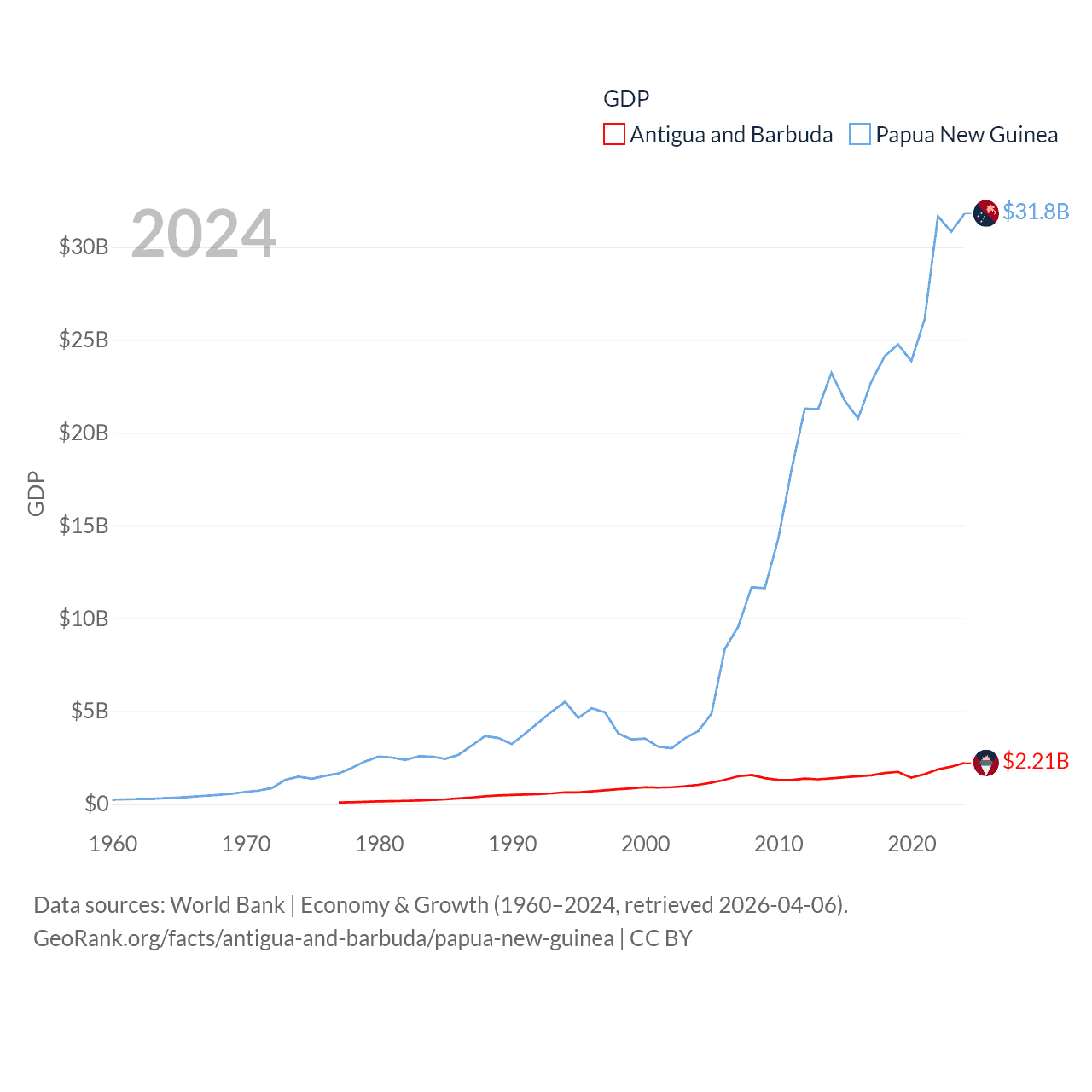 By GDP, Antigua and Barbuda ranks 177/197 ($2.21B) and Papua New Guinea ranks 110/197 ($31.8B). By GDP per capita, Antigua and Barbuda ranks 53/197 ($23,542), while Papua New Guinea ranks 140/197 ($3,007).