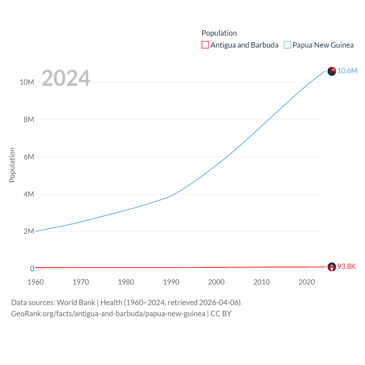 Antigua and Barbuda has a population of 93.8K (ranked 185/197), compared with 10.6M in Papua New Guinea (ranked 92/197). Antigua and Barbuda's land area is 169.9 sq mi versus 174,850 sq mi for Papua New Guinea (ranked 183rd vs. 54th).