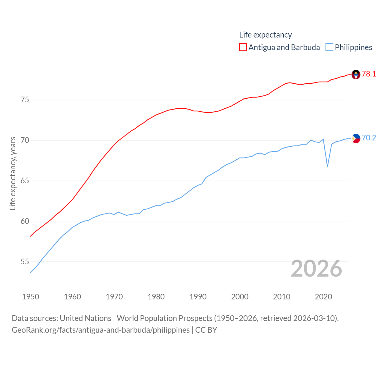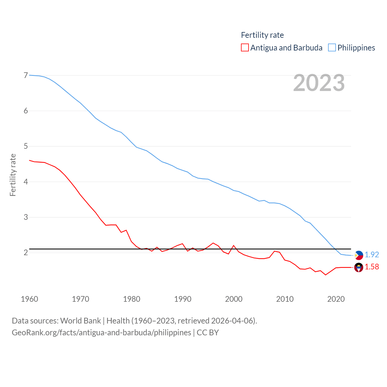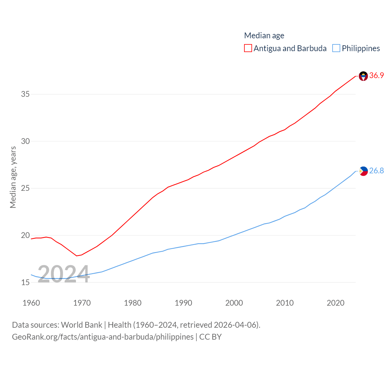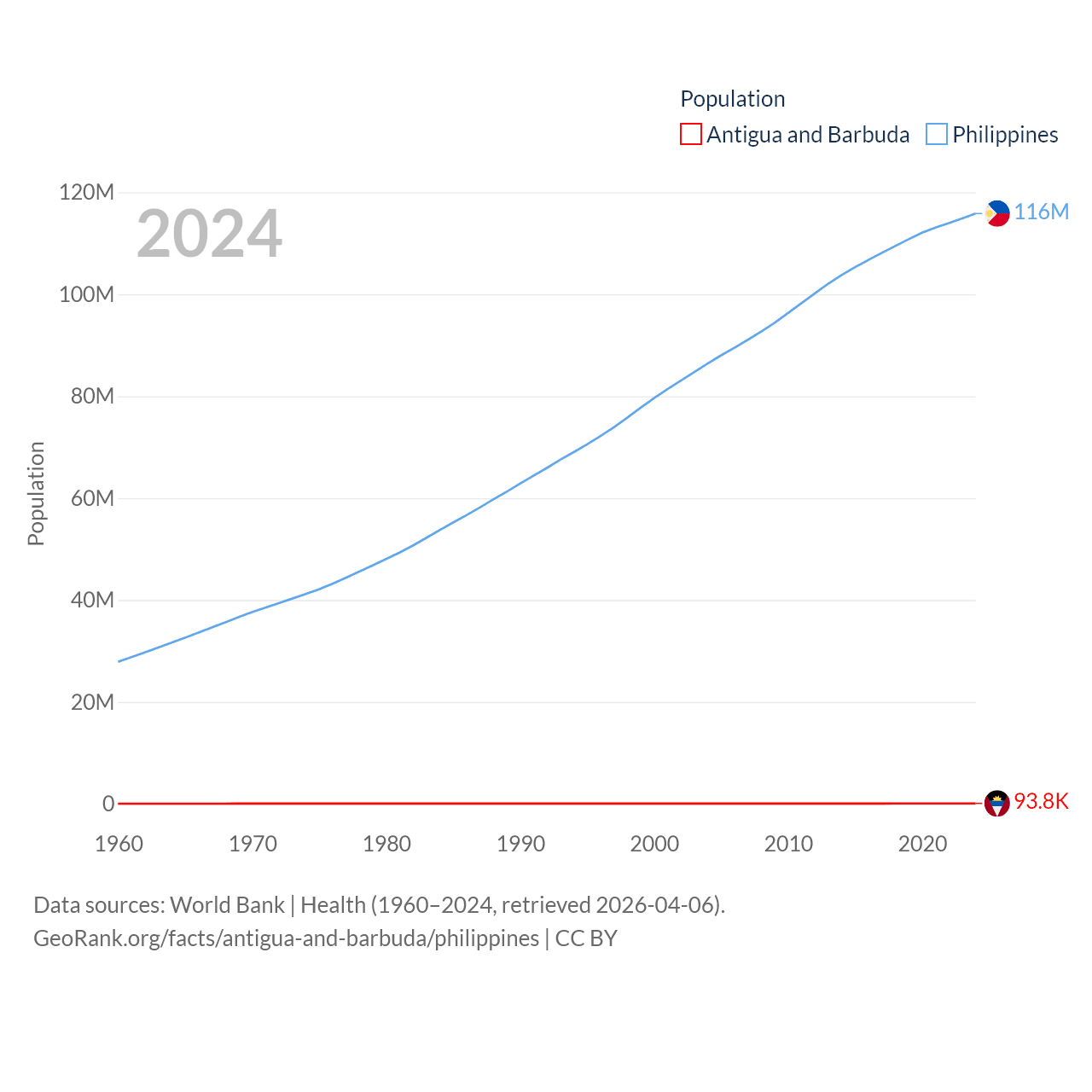 Antigua and Barbuda has a population of 93.8K (ranked 185/197), compared with 116M in The Philippines (ranked 14/197). Antigua and Barbuda's land area is 169.9 sq mi versus 115,124 sq mi for The Philippines (ranked 183rd vs. 71st).