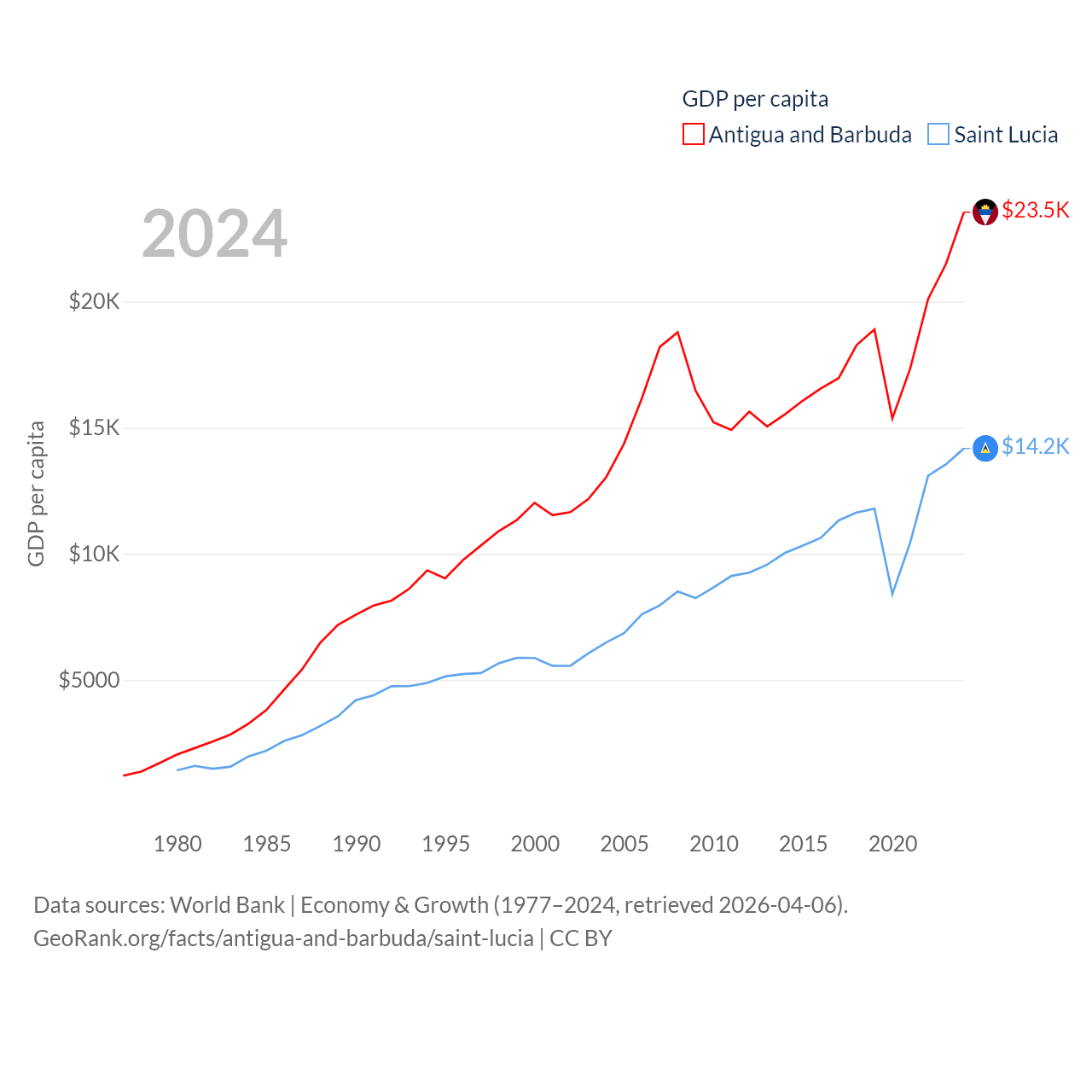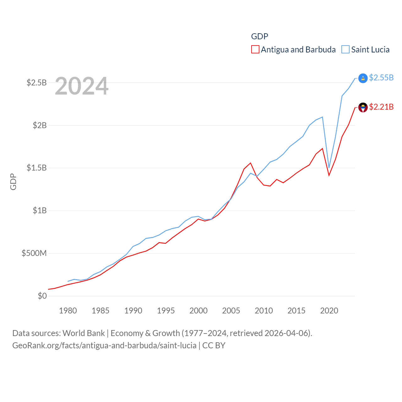 By GDP, Antigua and Barbuda ranks 177/197 ($2.21B) and Saint Lucia ranks 173/197 ($2.55B). By GDP per capita, Antigua and Barbuda ranks 53/197 ($23,542), while Saint Lucia ranks 70/197 ($14,182).