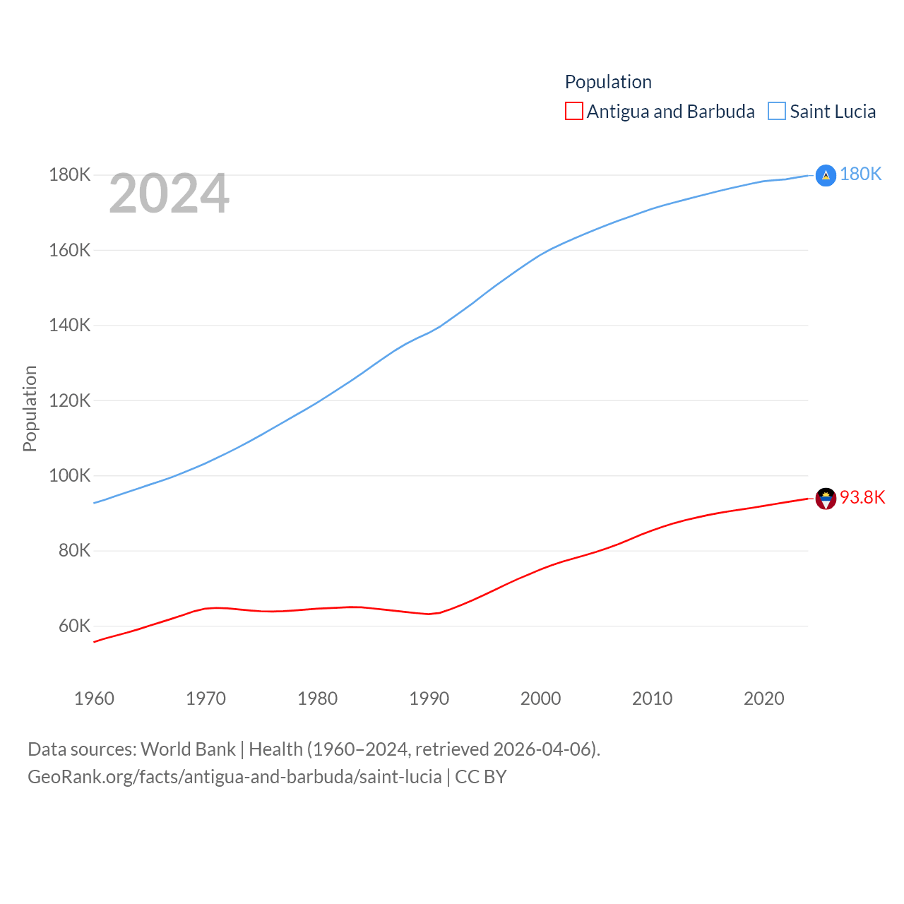 Antigua and Barbuda has a population of 93.8K (ranked 185/197), compared with 180K in Saint Lucia (ranked 178/197). Antigua and Barbuda's land area is 169.9 sq mi versus 235.5 sq mi for Saint Lucia (ranked 183rd vs. 178th).