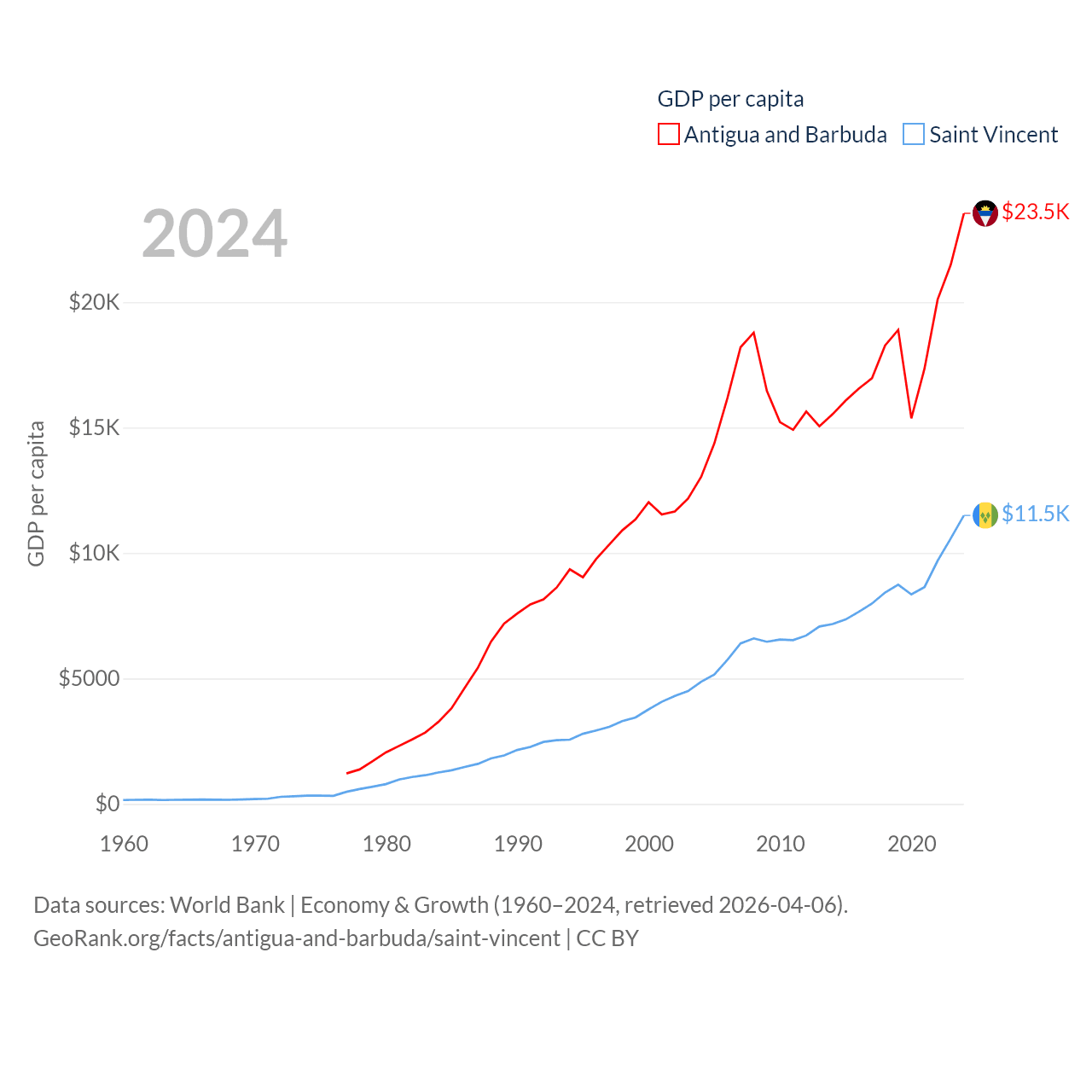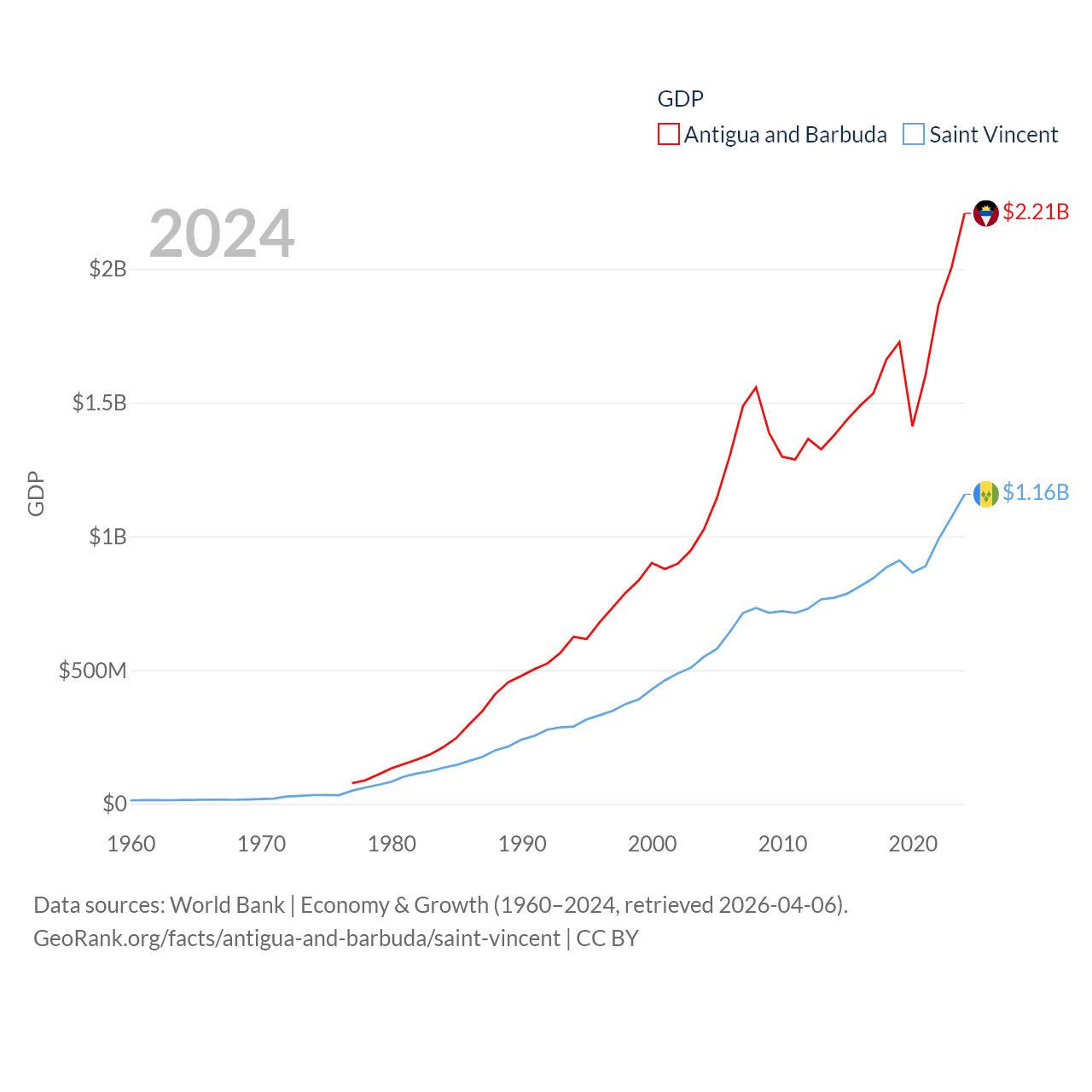 By GDP, Antigua and Barbuda ranks 177/197 ($2.21B) and Saint Vincent ranks 186/197 ($1.16B). By GDP per capita, Antigua and Barbuda ranks 53/197 ($23,542), while Saint Vincent ranks 81/197 ($11,501).