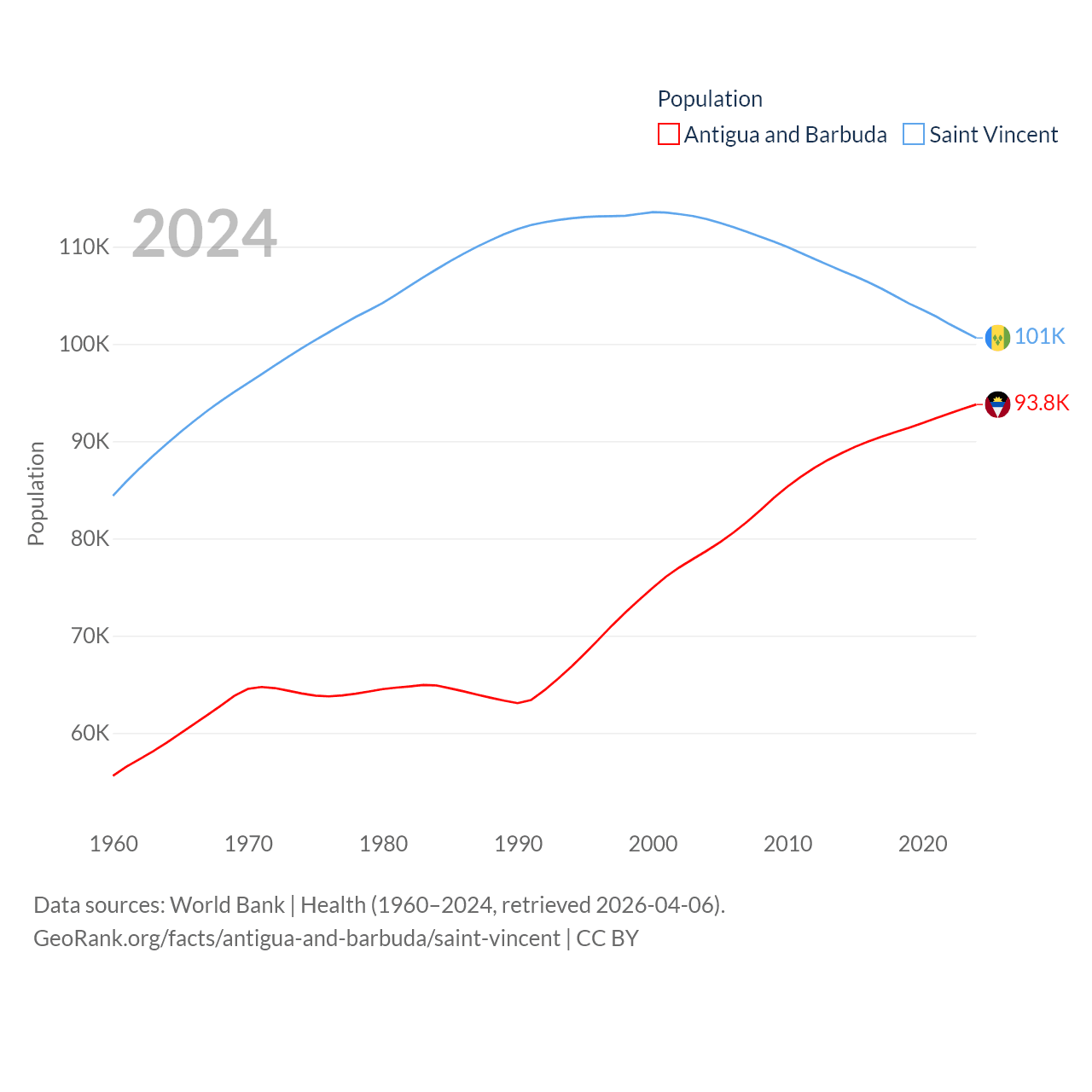 Antigua and Barbuda has a population of 93.8K (ranked 185/197), compared with 101K in Saint Vincent (ranked 184/197). Antigua and Barbuda's land area is 169.9 sq mi versus 150.6 sq mi for Saint Vincent (ranked 183rd vs. 185th).