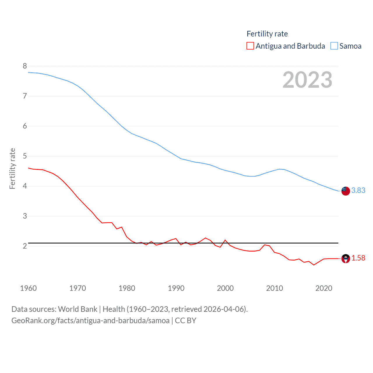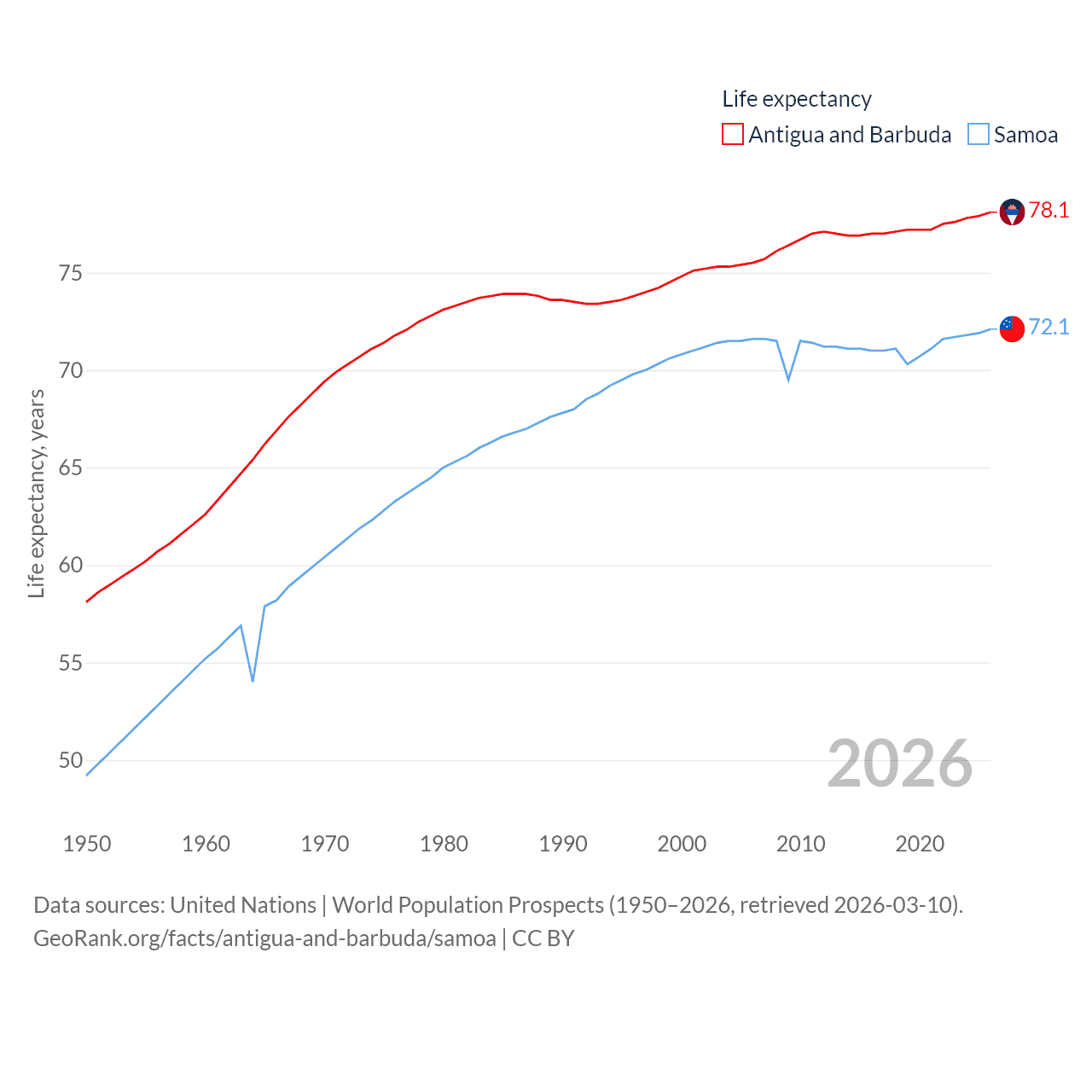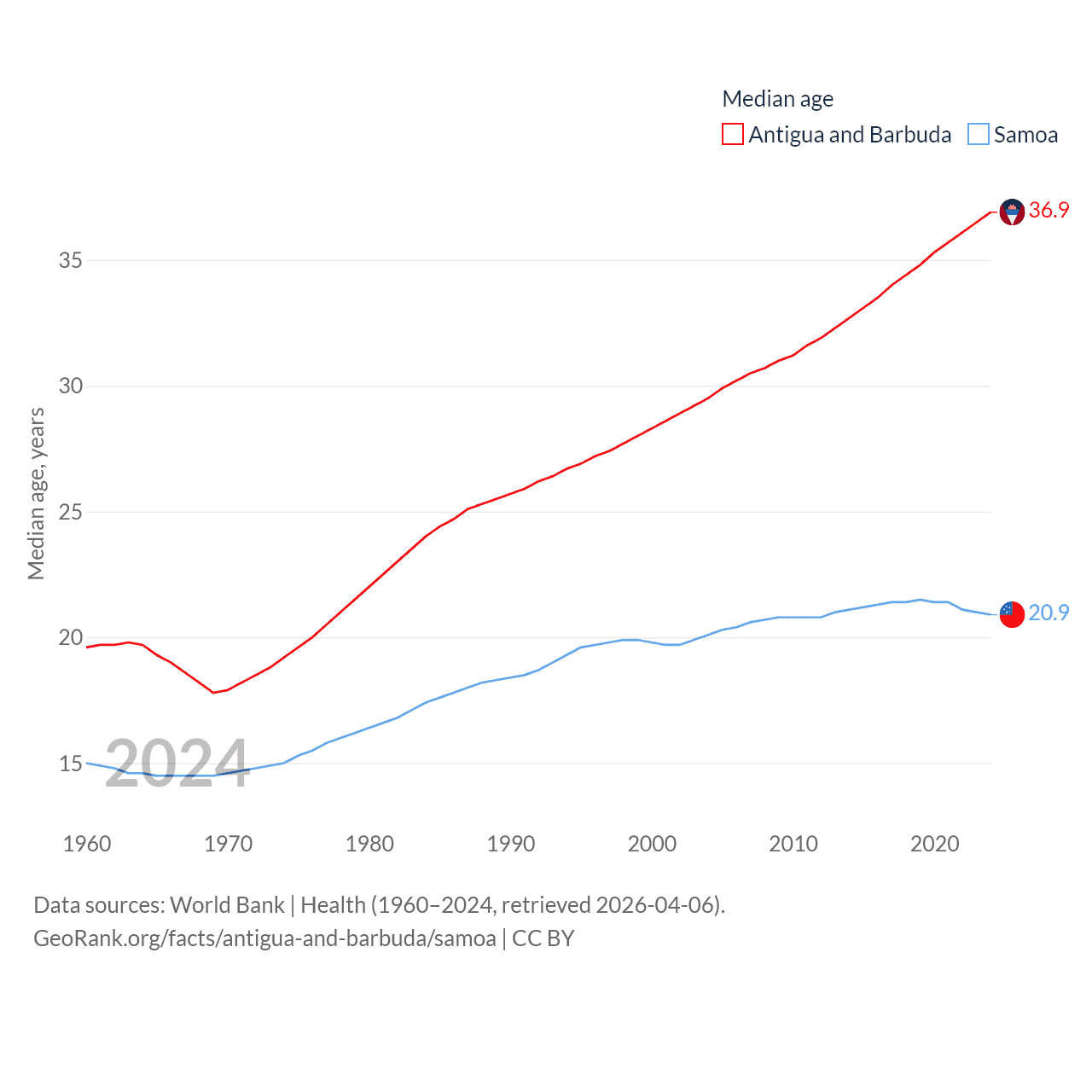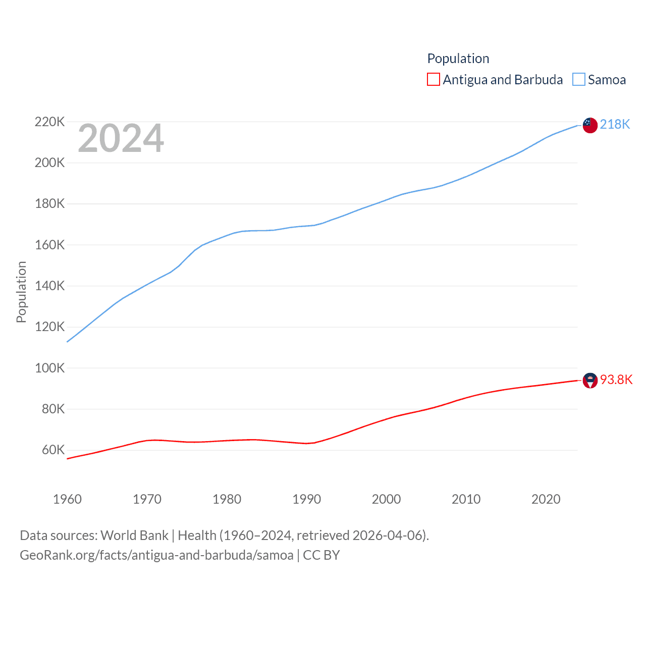 Antigua and Barbuda has a population of 93.8K (ranked 185/197), compared with 218K in Samoa (ranked 177/197). Antigua and Barbuda's land area is 169.9 sq mi versus 1,073 sq mi for Samoa (ranked 183rd vs. 168th).