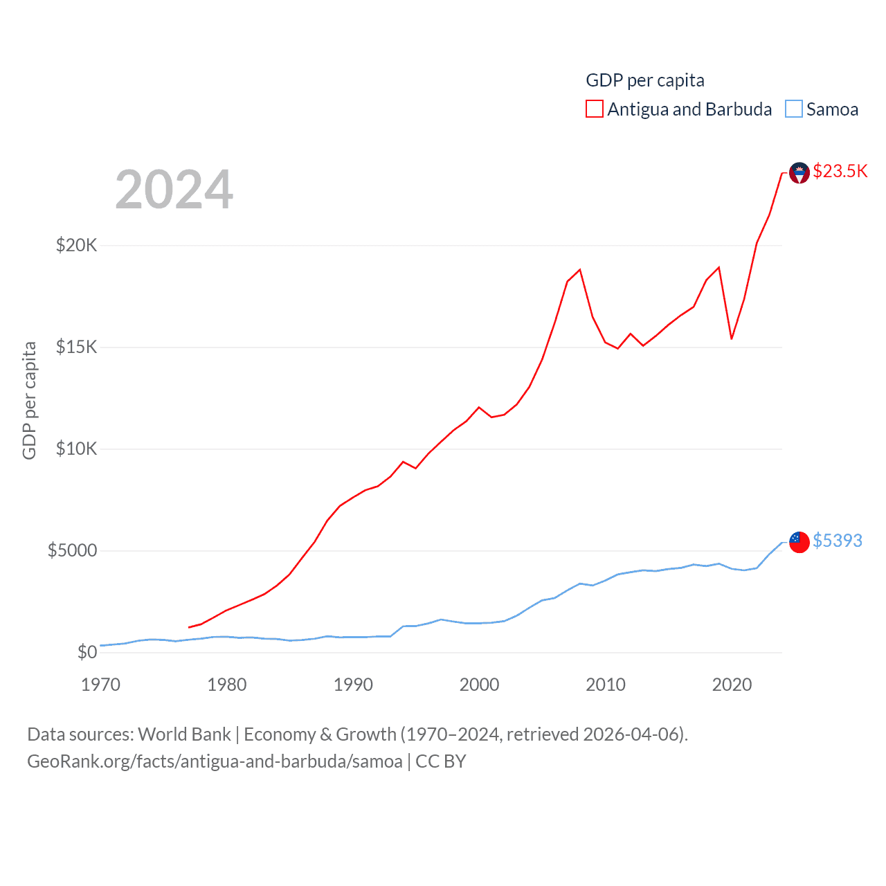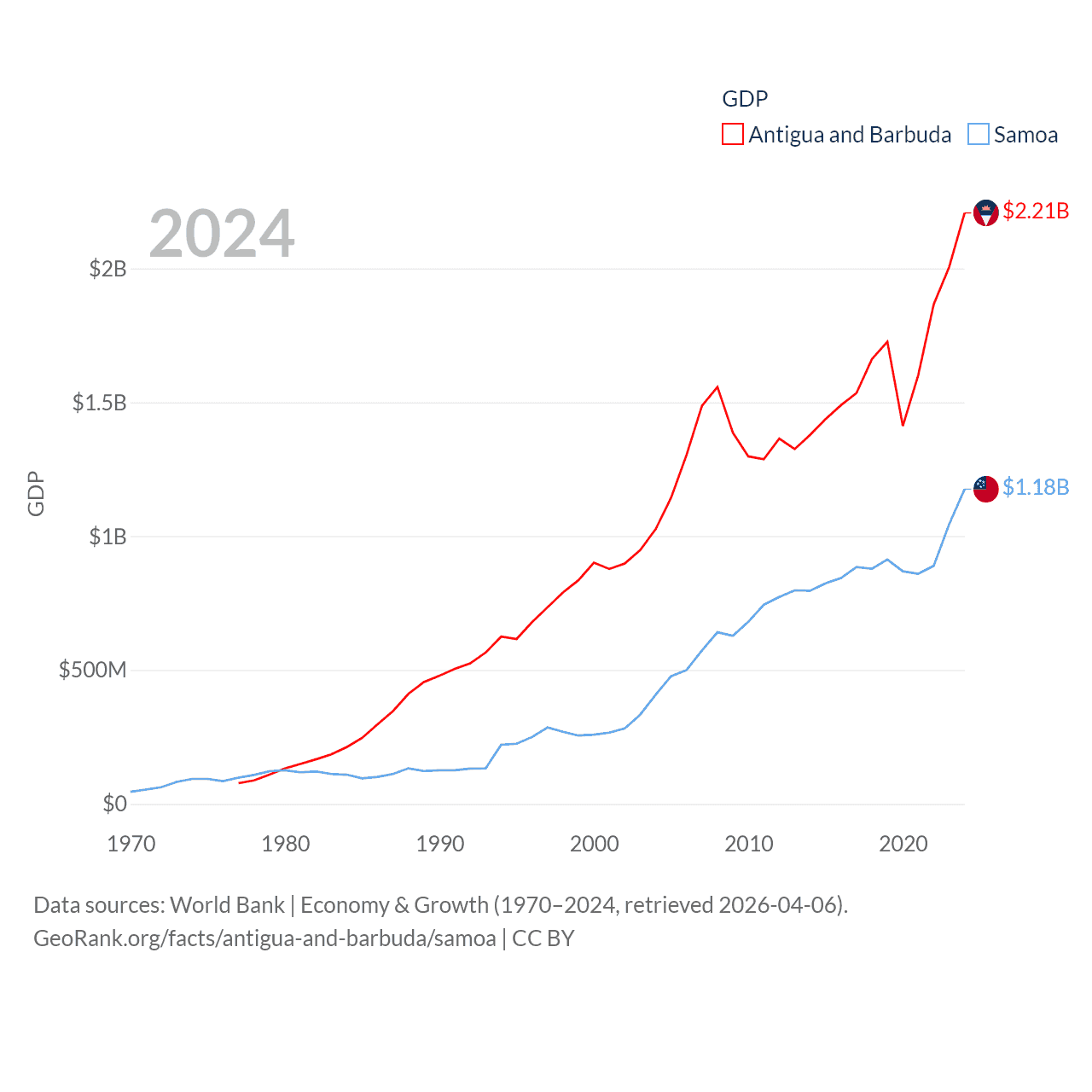 By GDP, Antigua and Barbuda ranks 177/197 ($2.21B) and Samoa ranks 185/197 ($1.18B). By GDP per capita, Antigua and Barbuda ranks 53/197 ($23,542), while Samoa ranks 117/197 ($5,393).