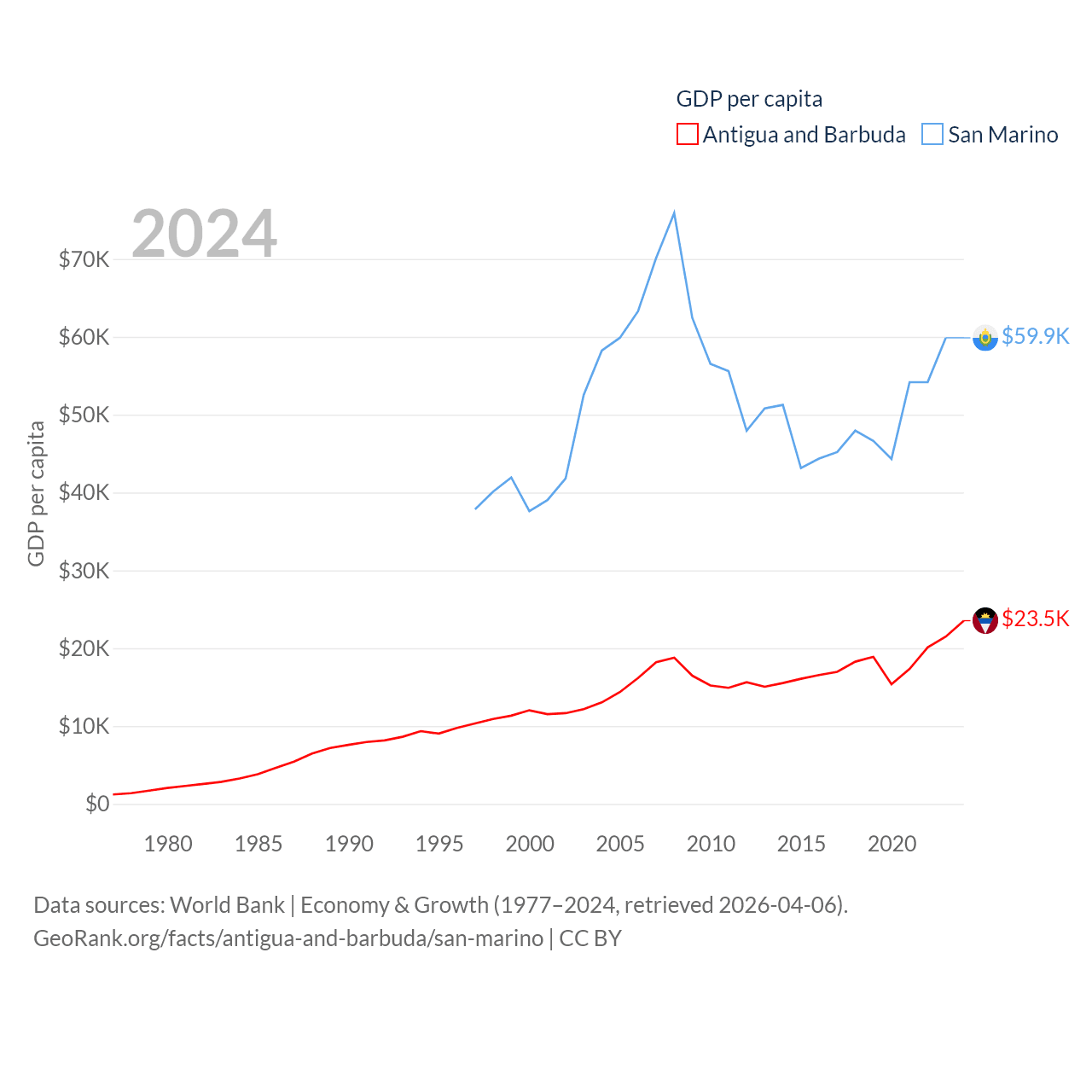 By GDP, Antigua and Barbuda ranks 177/197 ($2.21B) and San Marino ranks 180/197 ($2.03B). By GDP per capita, Antigua and Barbuda ranks 53/197 ($23,542), while San Marino ranks 15/197 ($59,880).