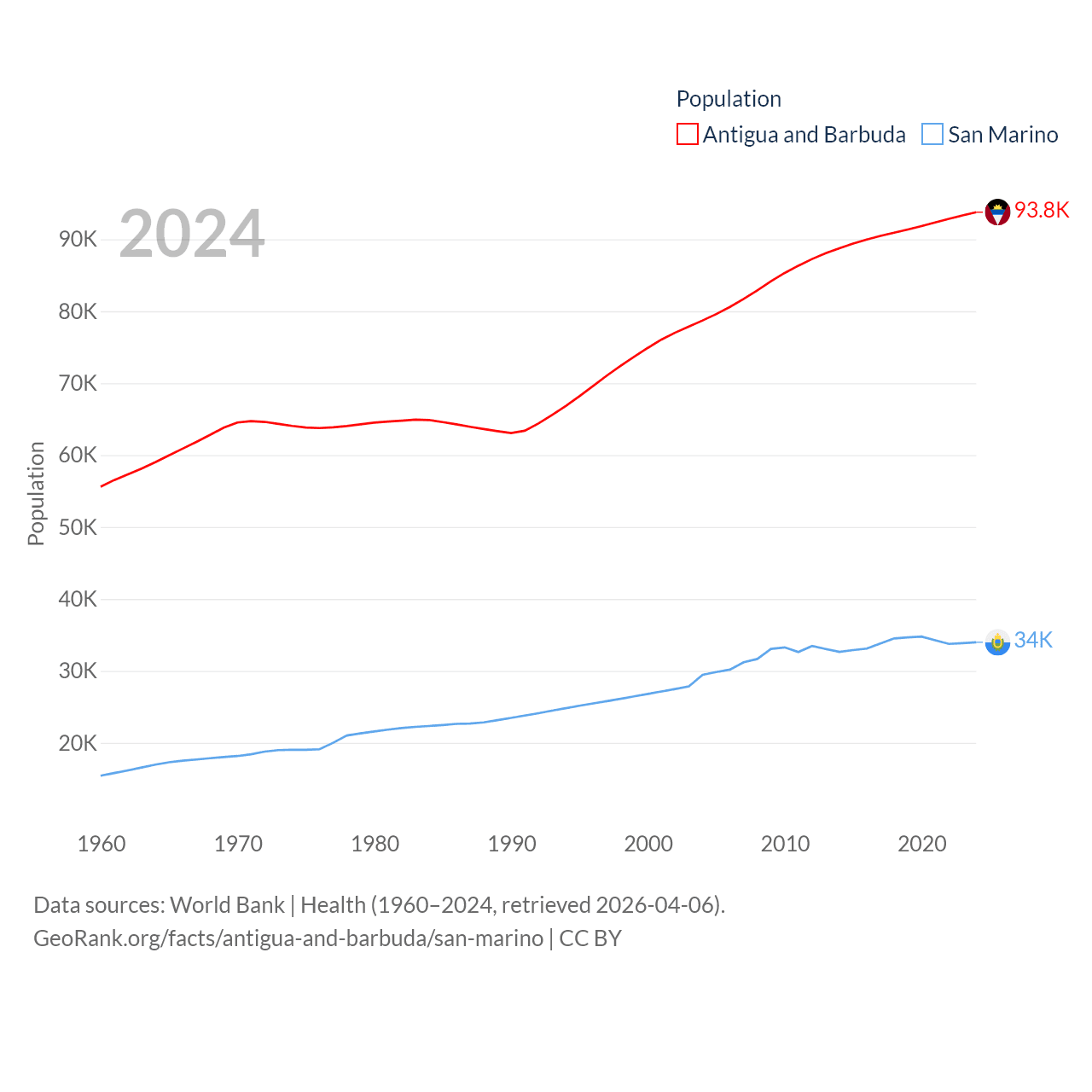 Antigua and Barbuda has a population of 93.8K (ranked 185/197), compared with 34K in San Marino (ranked 193/197). Antigua and Barbuda's land area is 169.9 sq mi versus 23.2 sq mi for San Marino (ranked 183rd vs. 193rd).