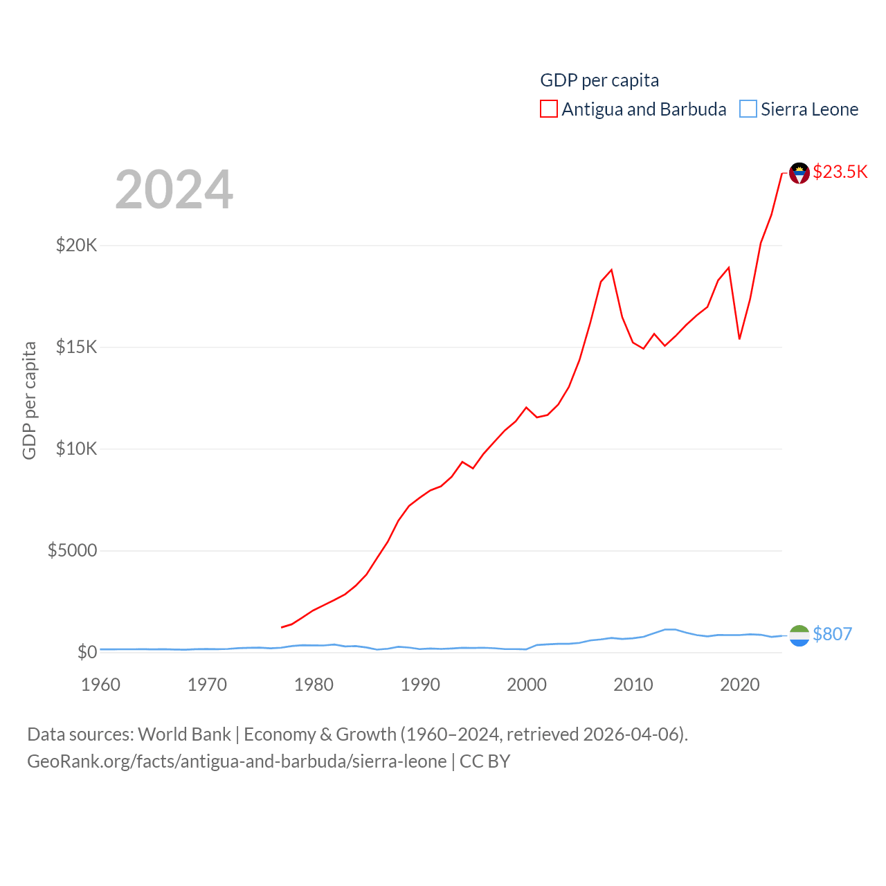 By GDP, Antigua and Barbuda ranks 177/197 ($2.21B) and Sierra Leone ranks 160/197 ($6.97B). By GDP per capita, Antigua and Barbuda ranks 53/197 ($23,542), while Sierra Leone ranks 186/197 ($807).