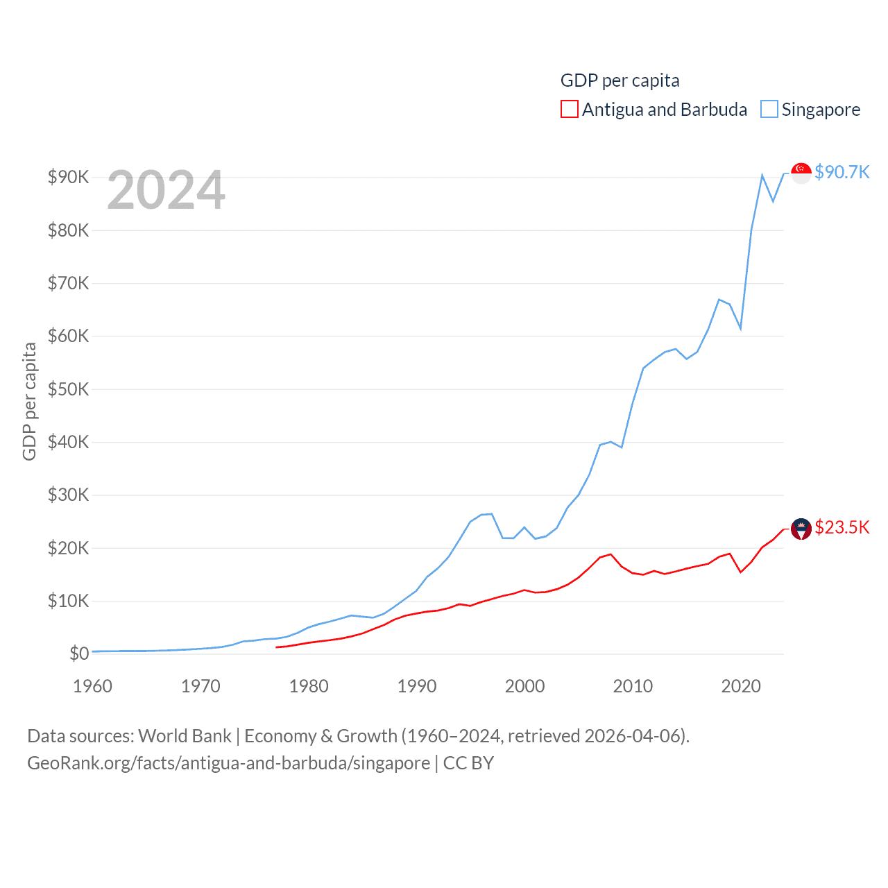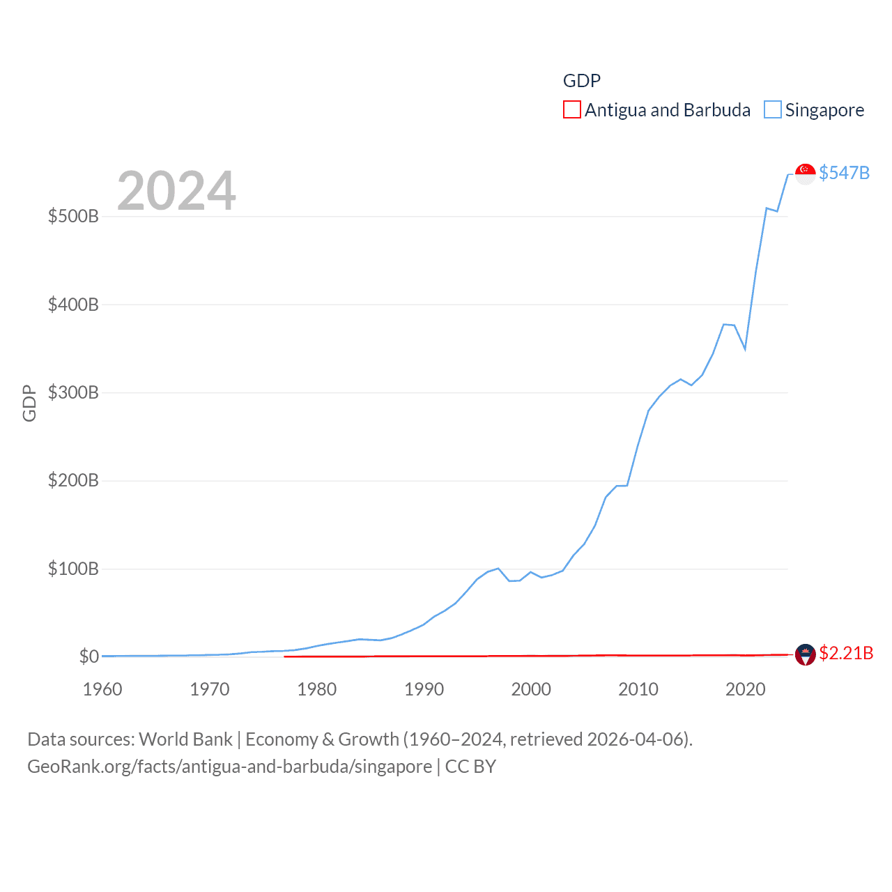 By GDP, Antigua and Barbuda ranks 177/197 ($2.21B) and Singapore ranks 28/197 ($547B). By GDP per capita, Antigua and Barbuda ranks 53/197 ($23,542), while Singapore ranks 7/197 ($90,674).