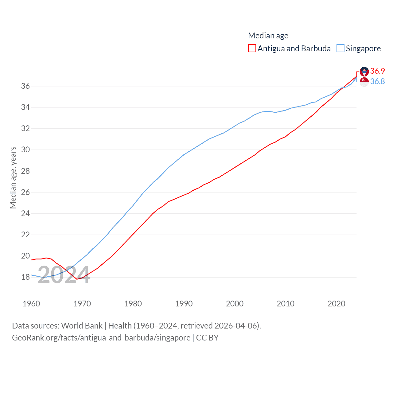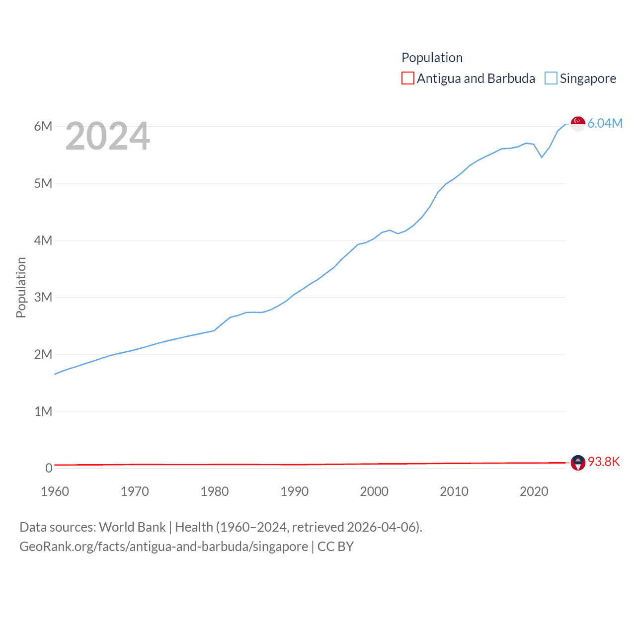 Antigua and Barbuda has a population of 93.8K (ranked 185/197), compared with 6.04M in Singapore (ranked 113/197). Antigua and Barbuda's land area is 169.9 sq mi versus 277.2 sq mi for Singapore (ranked 183rd vs. 177th).