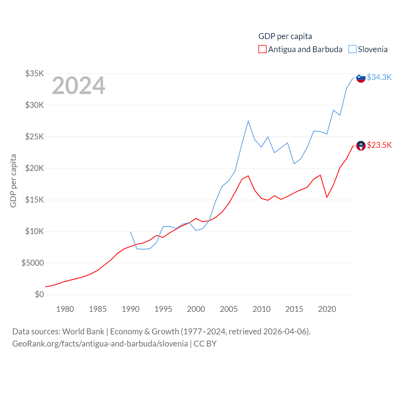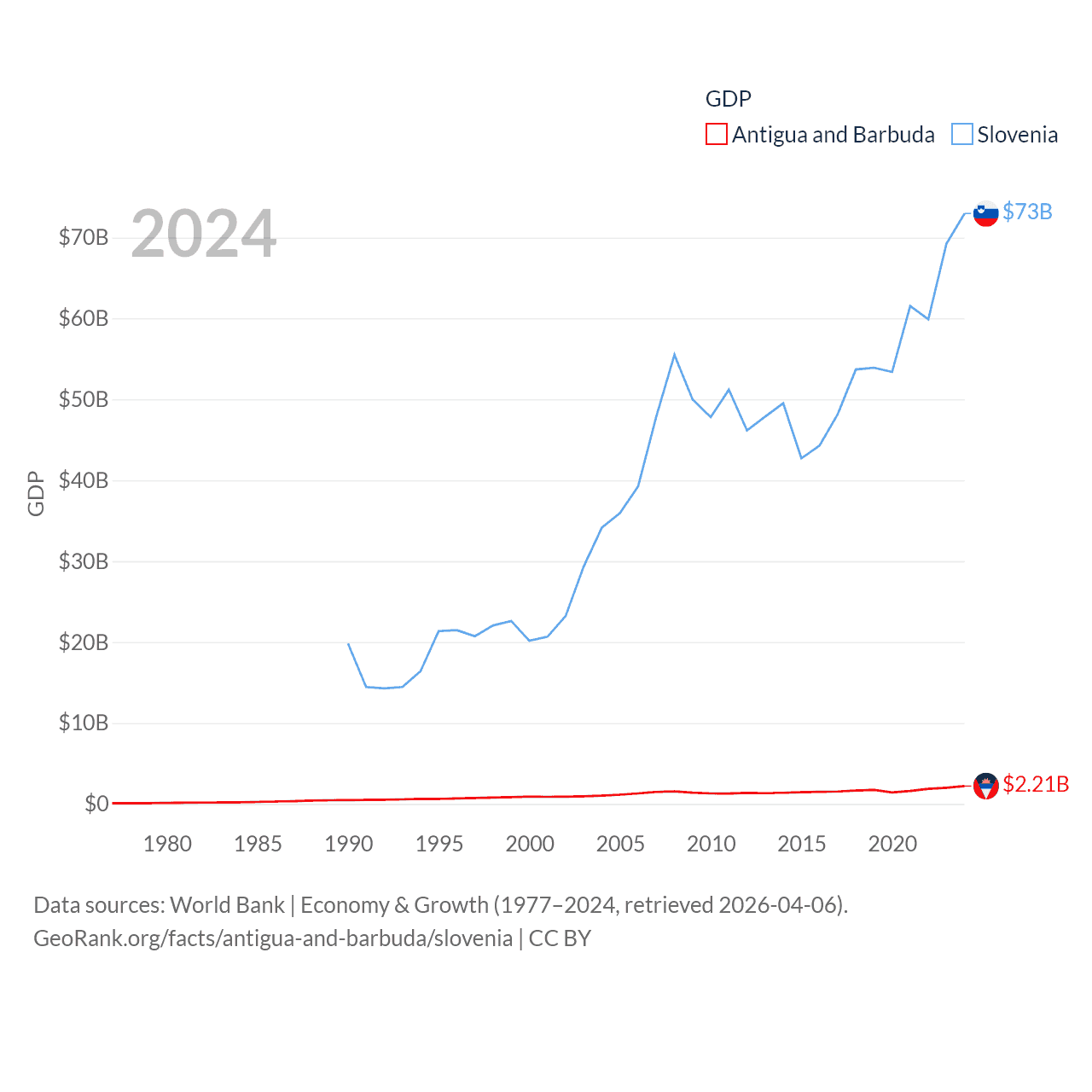 By GDP, Antigua and Barbuda ranks 177/197 ($2.21B) and Slovenia ranks 86/197 ($73B). By GDP per capita, Antigua and Barbuda ranks 53/197 ($23,542), while Slovenia ranks 34/197 ($34,301).