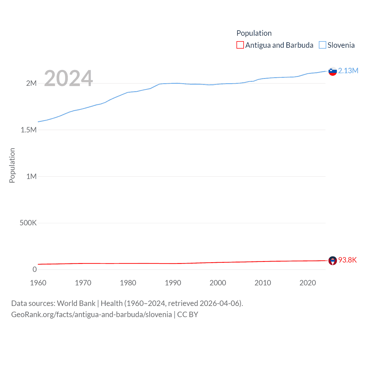 Antigua and Barbuda has a population of 93.8K (ranked 185/197), compared with 2.13M in Slovenia (ranked 147/197). Antigua and Barbuda's land area is 169.9 sq mi versus 7,774 sq mi for Slovenia (ranked 183rd vs. 151st).