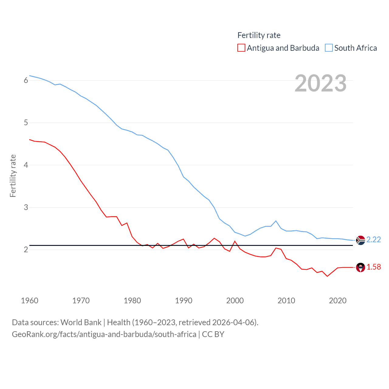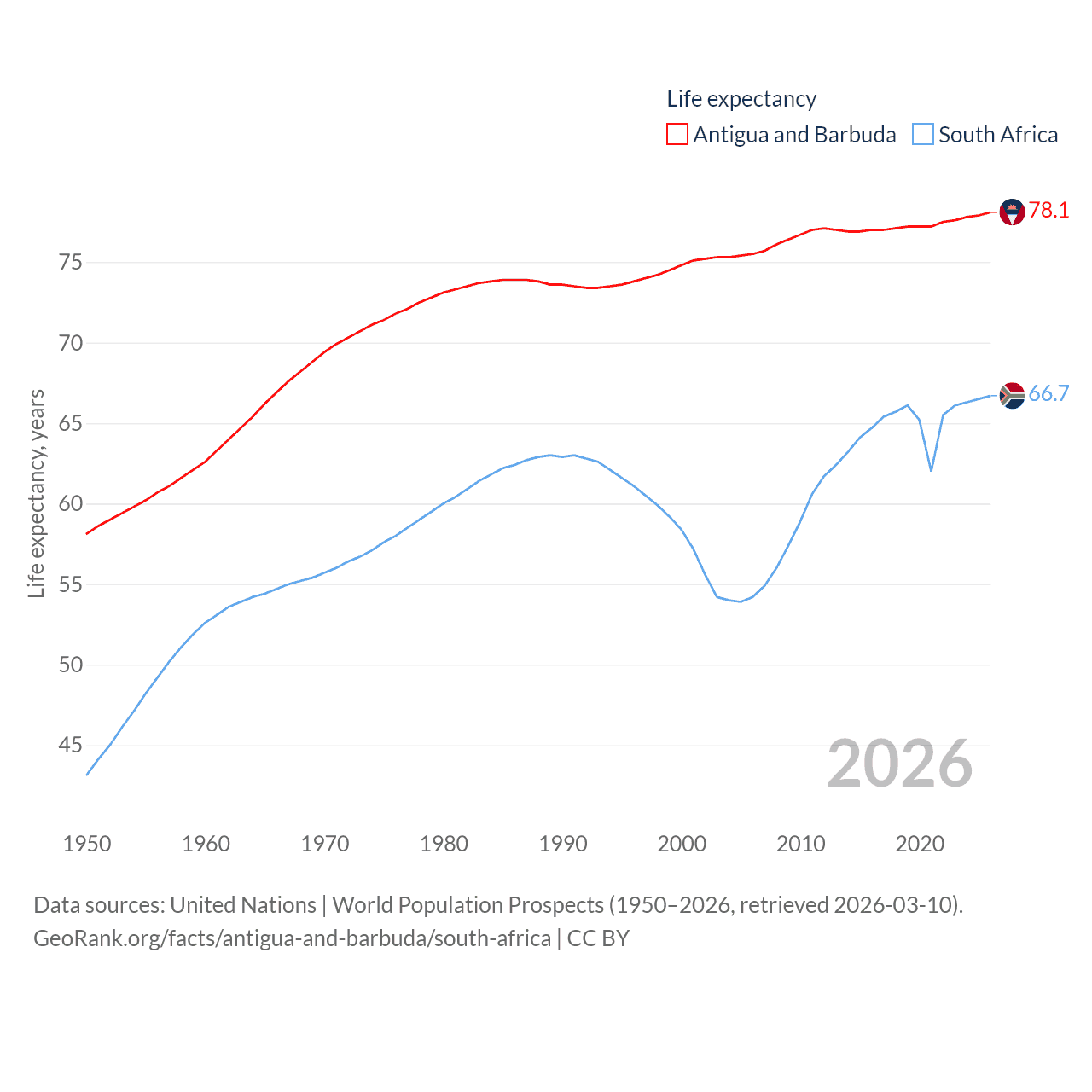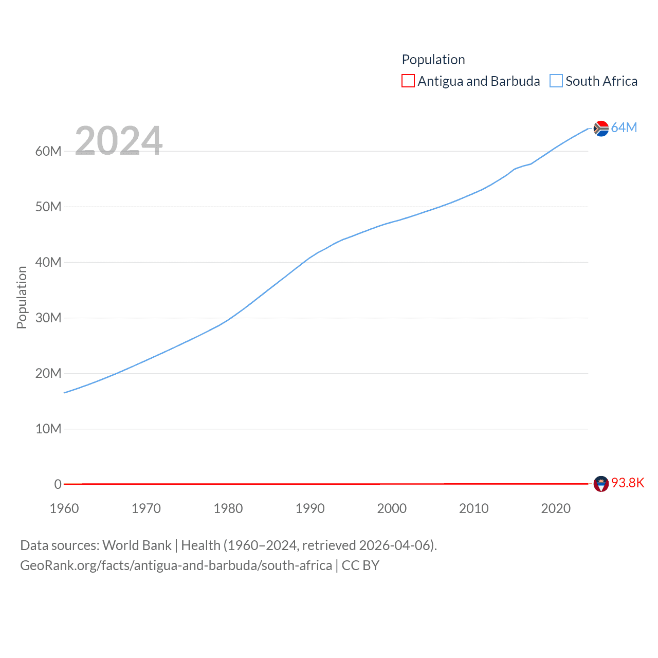 Antigua and Barbuda has a population of 93.8K (ranked 185/197), compared with 64M in South Africa (ranked 24/197). Antigua and Barbuda's land area is 169.9 sq mi versus 468,377 sq mi for South Africa (ranked 183rd vs. 24th).