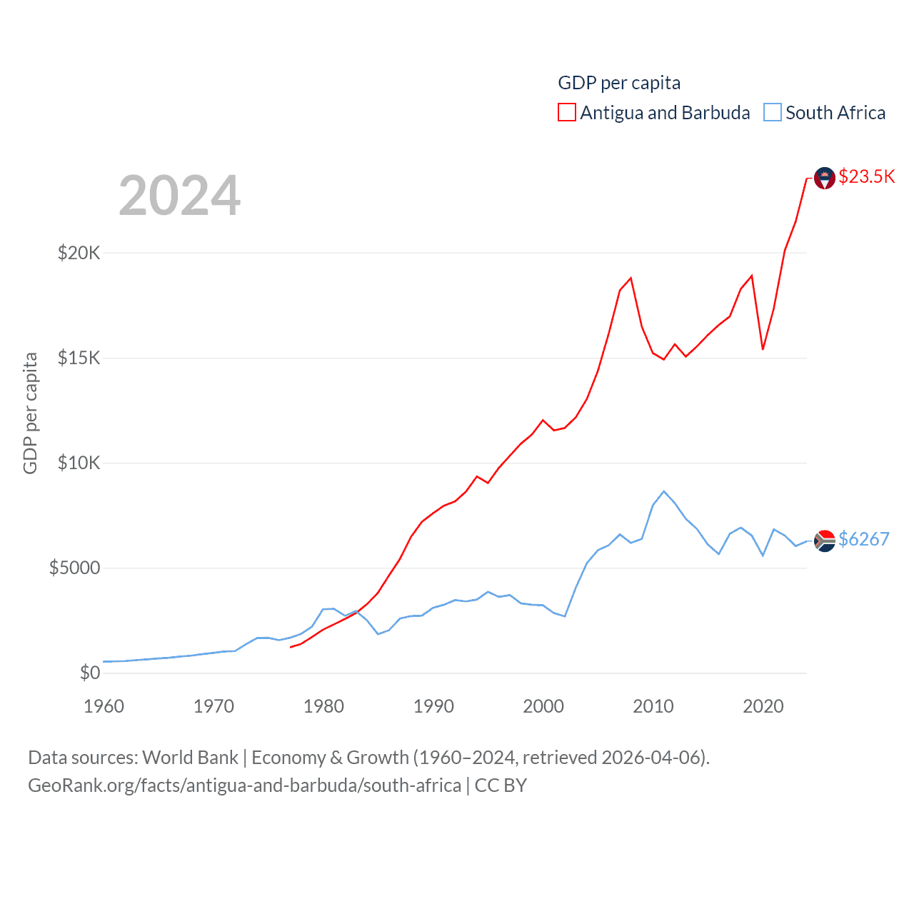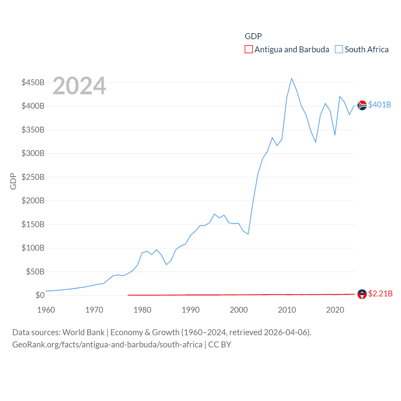 By GDP, Antigua and Barbuda ranks 177/197 ($2.21B) and South Africa ranks 40/197 ($401B). By GDP per capita, Antigua and Barbuda ranks 53/197 ($23,542), while South Africa ranks 111/197 ($6,267).