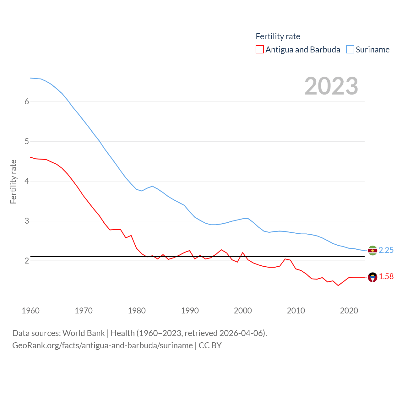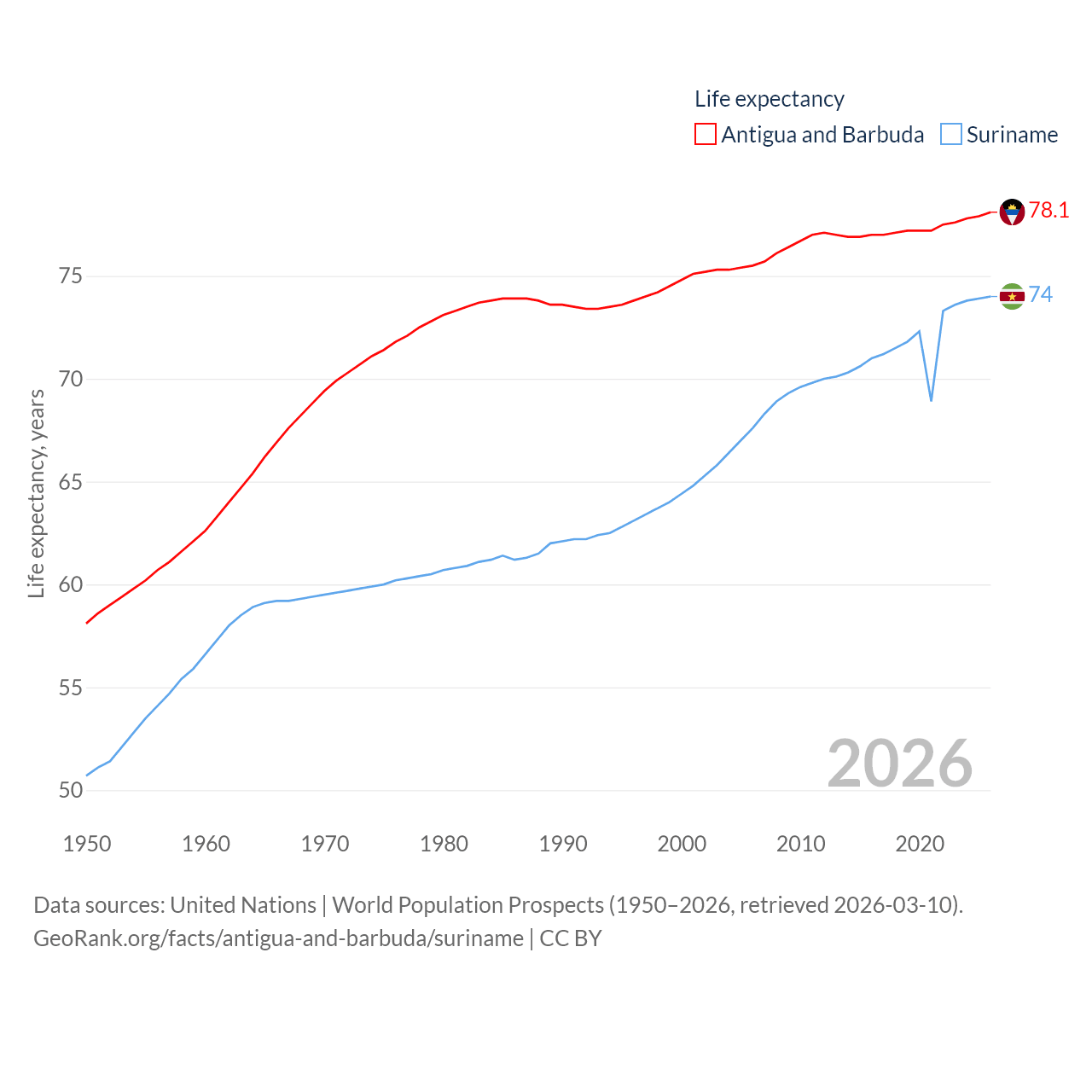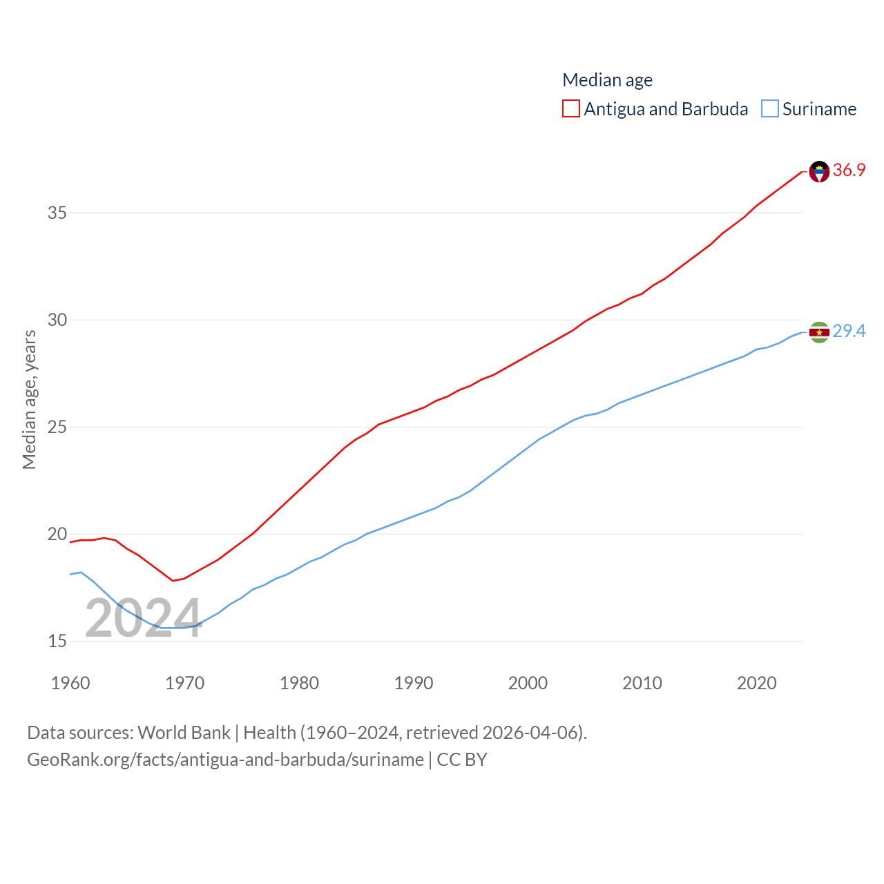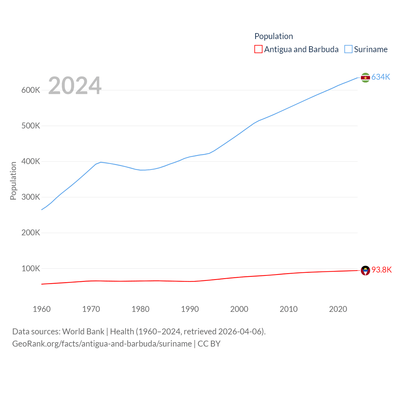 Antigua and Barbuda has a population of 93.8K (ranked 185/197), compared with 634K in Suriname (ranked 165/197). Antigua and Barbuda's land area is 169.9 sq mi versus 61,972 sq mi for Suriname (ranked 183rd vs. 90th).