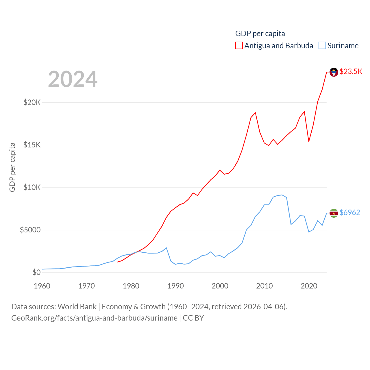 By GDP, Antigua and Barbuda ranks 177/197 ($2.21B) and Suriname ranks 164/197 ($4.42B). By GDP per capita, Antigua and Barbuda ranks 53/197 ($23,542), while Suriname ranks 102/197 ($6,962).