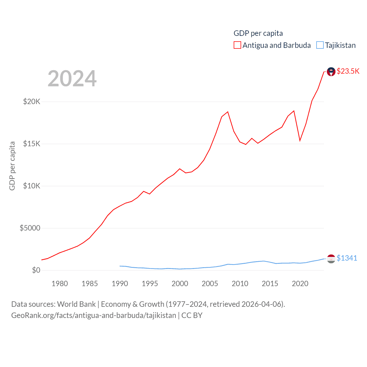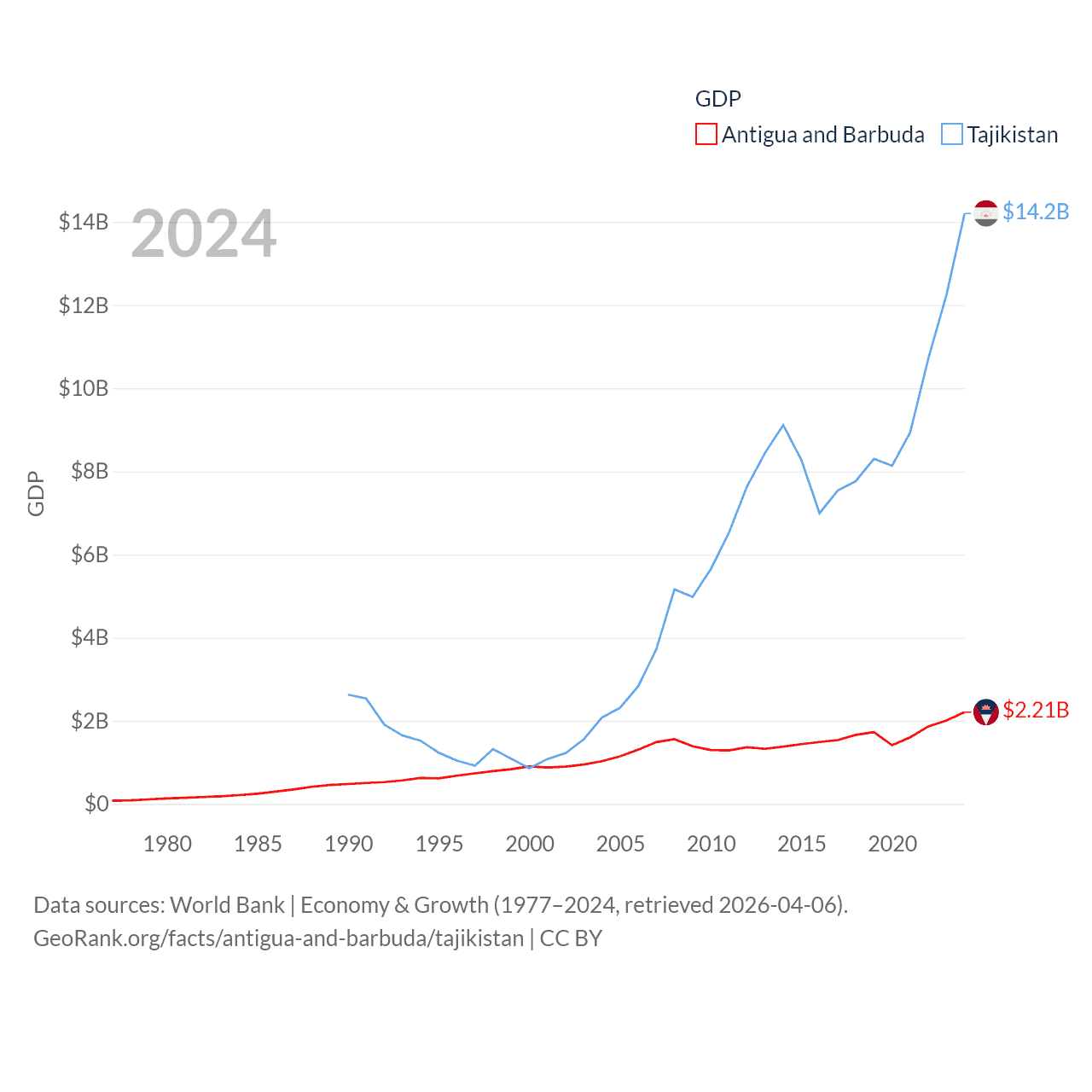 By GDP, Antigua and Barbuda ranks 177/197 ($2.21B) and Tajikistan ranks 145/197 ($14.2B). By GDP per capita, Antigua and Barbuda ranks 53/197 ($23,542), while Tajikistan ranks 166/197 ($1,341).