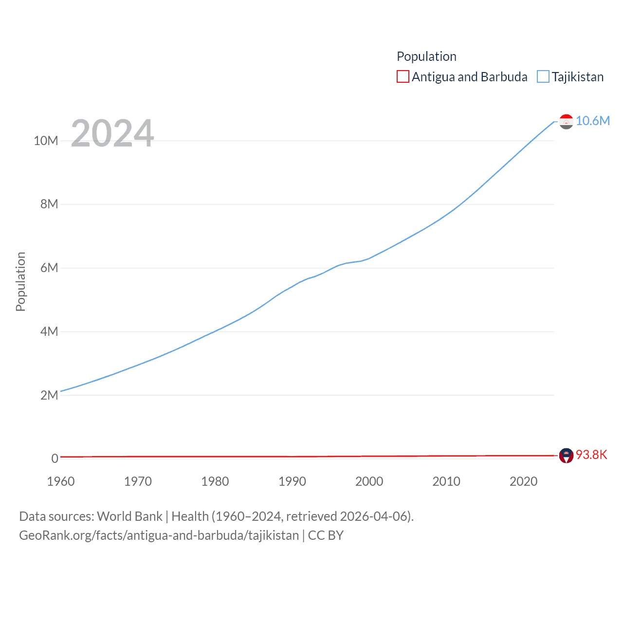 Antigua and Barbuda has a population of 93.8K (ranked 185/197), compared with 10.6M in Tajikistan (ranked 91/197). Antigua and Barbuda's land area is 169.9 sq mi versus 53,587 sq mi for Tajikistan (ranked 183rd vs. 93rd).