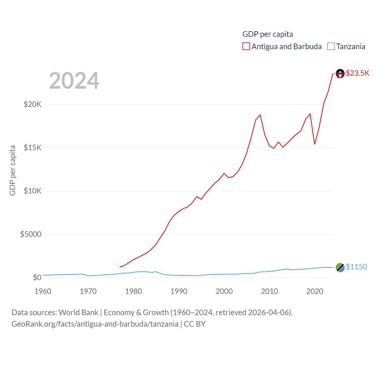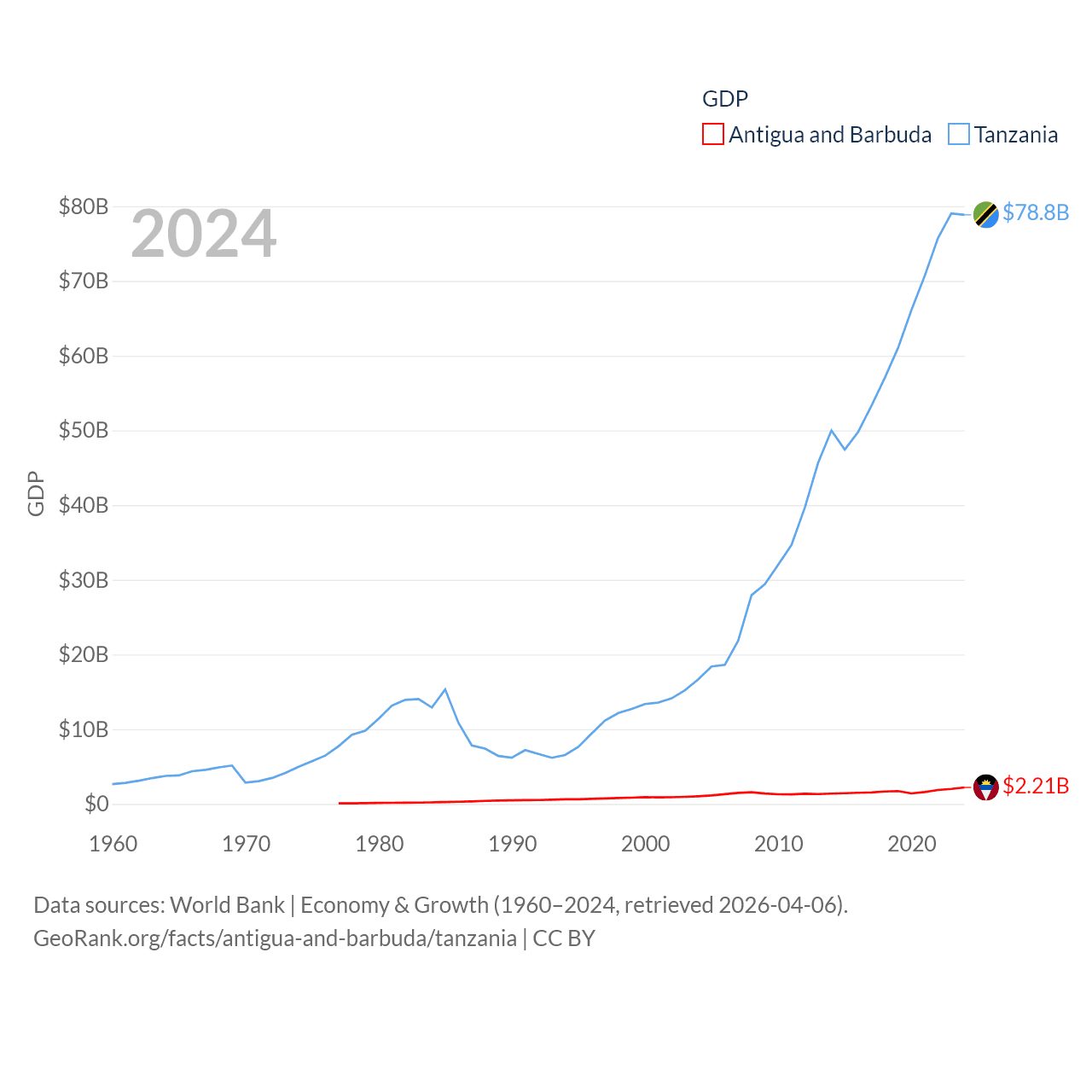 By GDP, Antigua and Barbuda ranks 177/197 ($2.21B) and Tanzania ranks 82/197 ($78.8B). By GDP per capita, Antigua and Barbuda ranks 53/197 ($23,542), while Tanzania ranks 170/197 ($1,150).