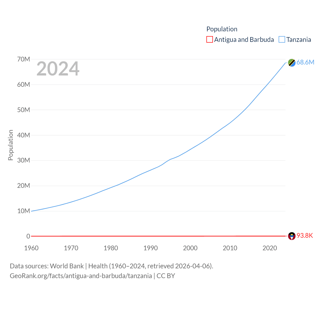 Antigua and Barbuda has a population of 93.8K (ranked 185/197), compared with 68.6M in Tanzania (ranked 22/197). Antigua and Barbuda's land area is 169.9 sq mi versus 342,009 sq mi for Tanzania (ranked 183rd vs. 31st).