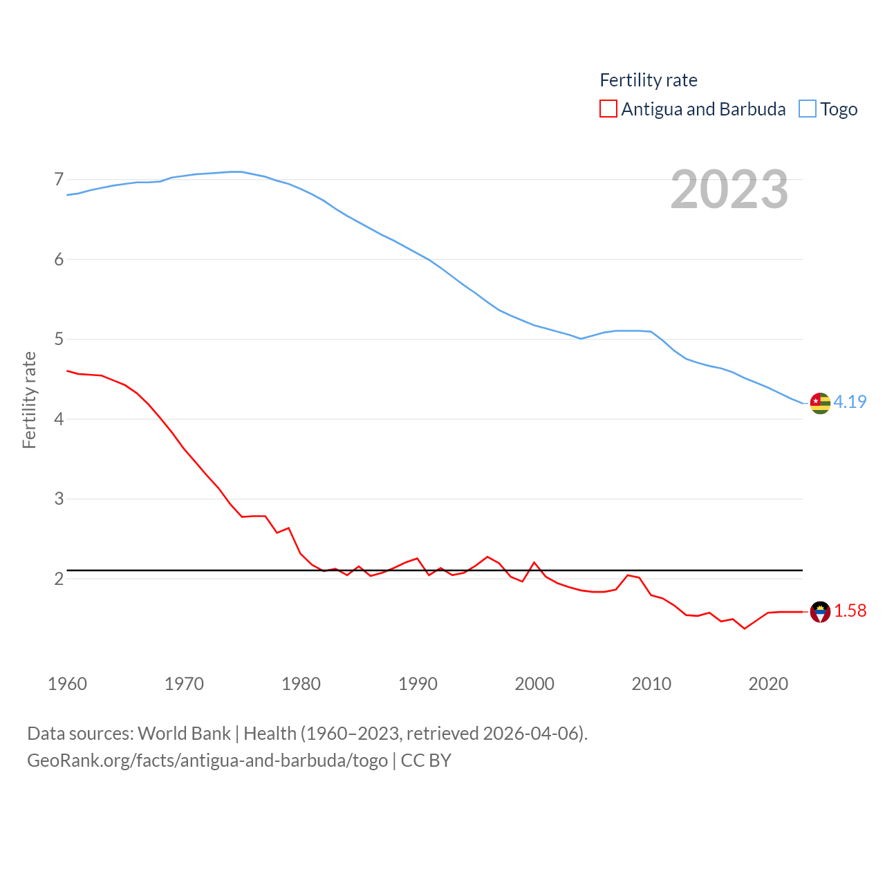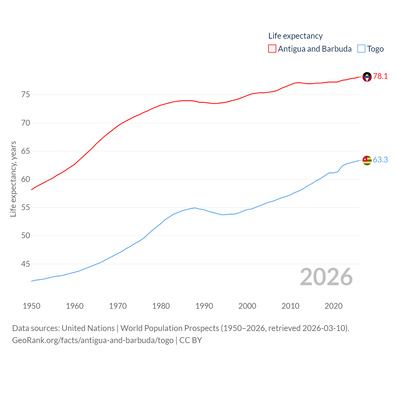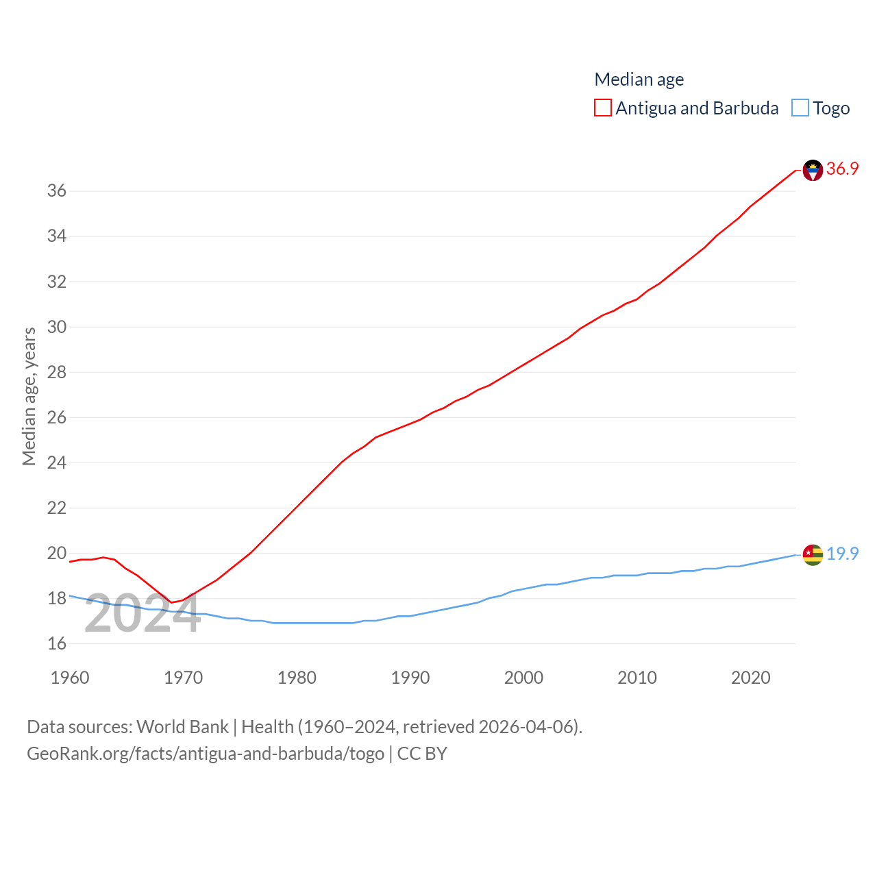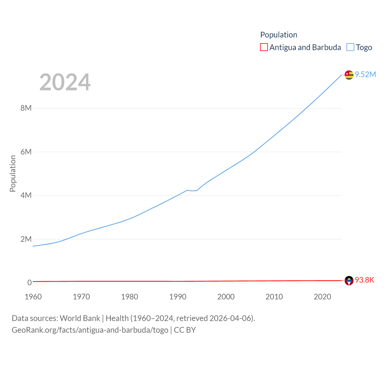 Antigua and Barbuda has a population of 93.8K (ranked 185/197), compared with 9.52M in Togo (ranked 98/197). Antigua and Barbuda's land area is 169.9 sq mi versus 21,000 sq mi for Togo (ranked 183rd vs. 124th).