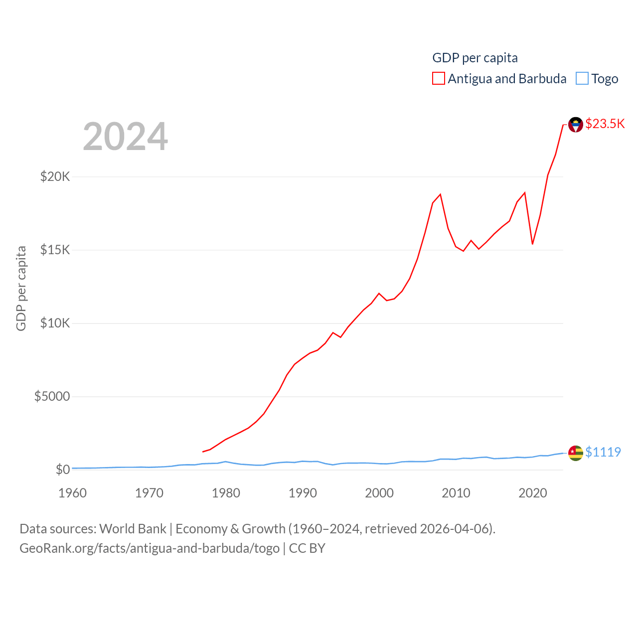 By GDP, Antigua and Barbuda ranks 177/197 ($2.21B) and Togo ranks 154/197 ($10.7B). By GDP per capita, Antigua and Barbuda ranks 53/197 ($23,542), while Togo ranks 172/197 ($1,119).