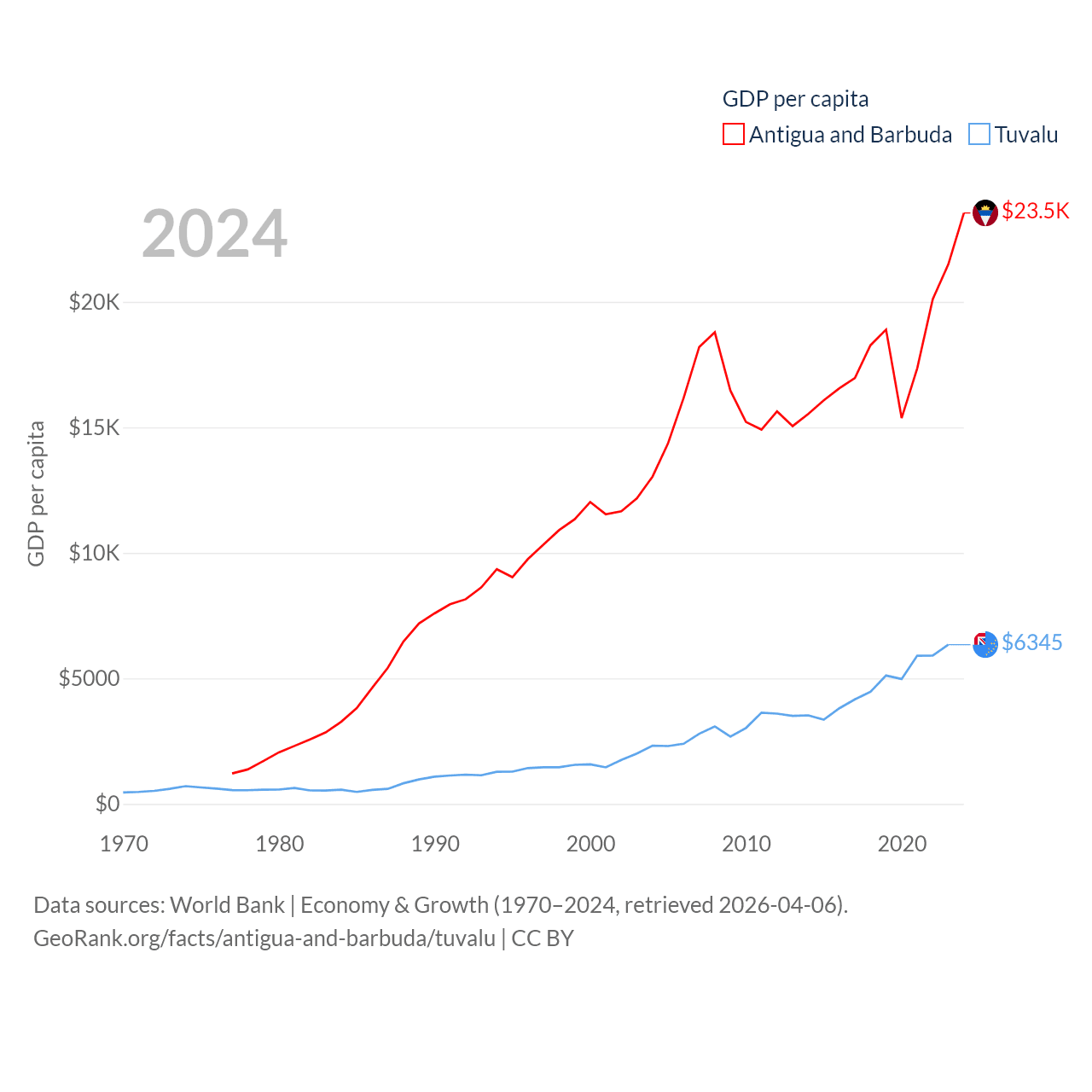 By GDP, Antigua and Barbuda ranks 177/197 ($2.21B) and Tuvalu ranks 196/197 ($62.3M). By GDP per capita, Antigua and Barbuda ranks 53/197 ($23,542), while Tuvalu ranks 110/197 ($6,345).