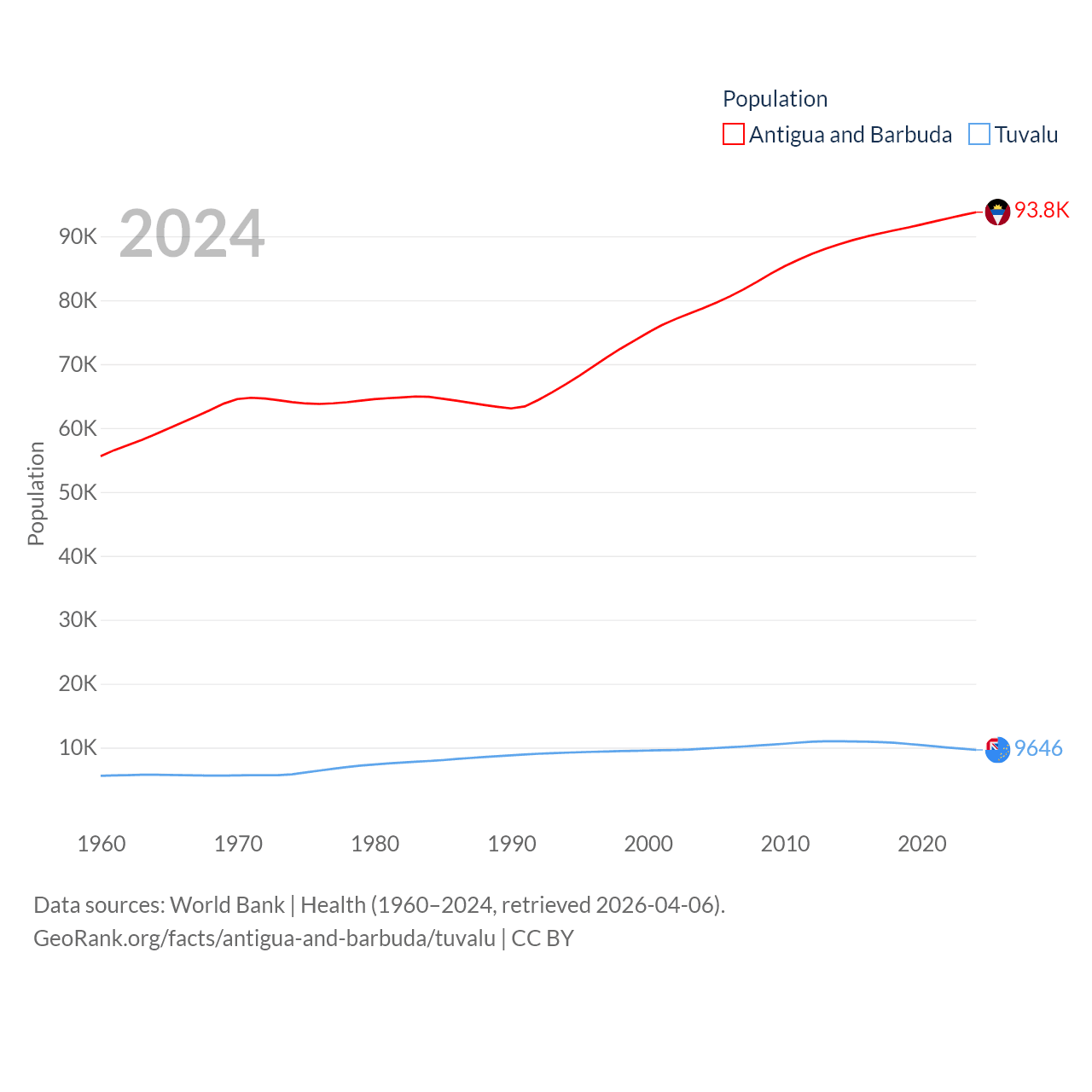 Antigua and Barbuda has a population of 93.8K (ranked 185/197), compared with 9.65K in Tuvalu (ranked 196/197). Antigua and Barbuda's land area is 169.9 sq mi versus 11.6 sq mi for Tuvalu (ranked 183rd vs. 194th).