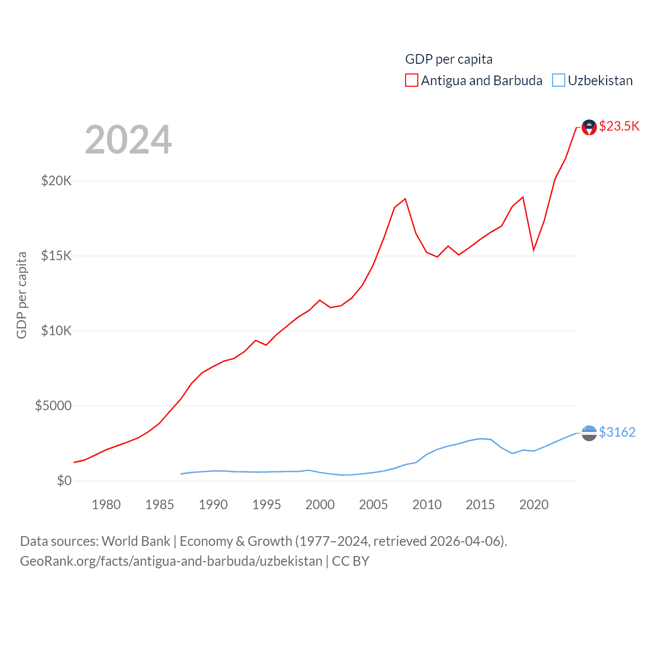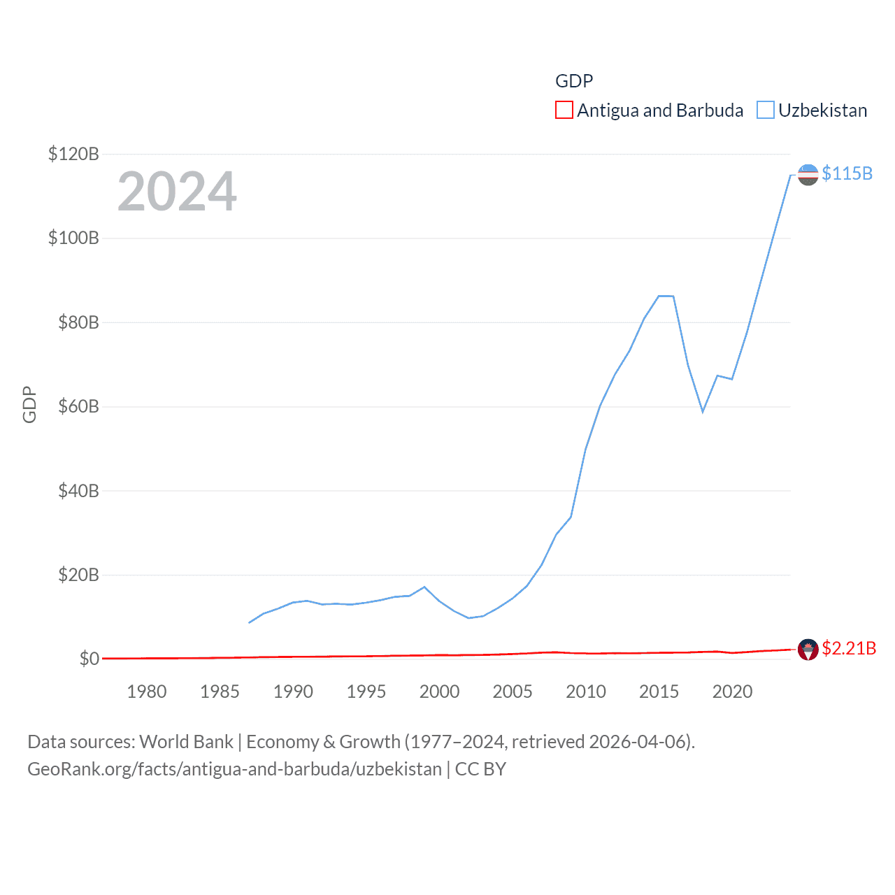 By GDP, Antigua and Barbuda ranks 177/197 ($2.21B) and Uzbekistan ranks 66/197 ($115B). By GDP per capita, Antigua and Barbuda ranks 53/197 ($23,542), while Uzbekistan ranks 139/197 ($3,162).