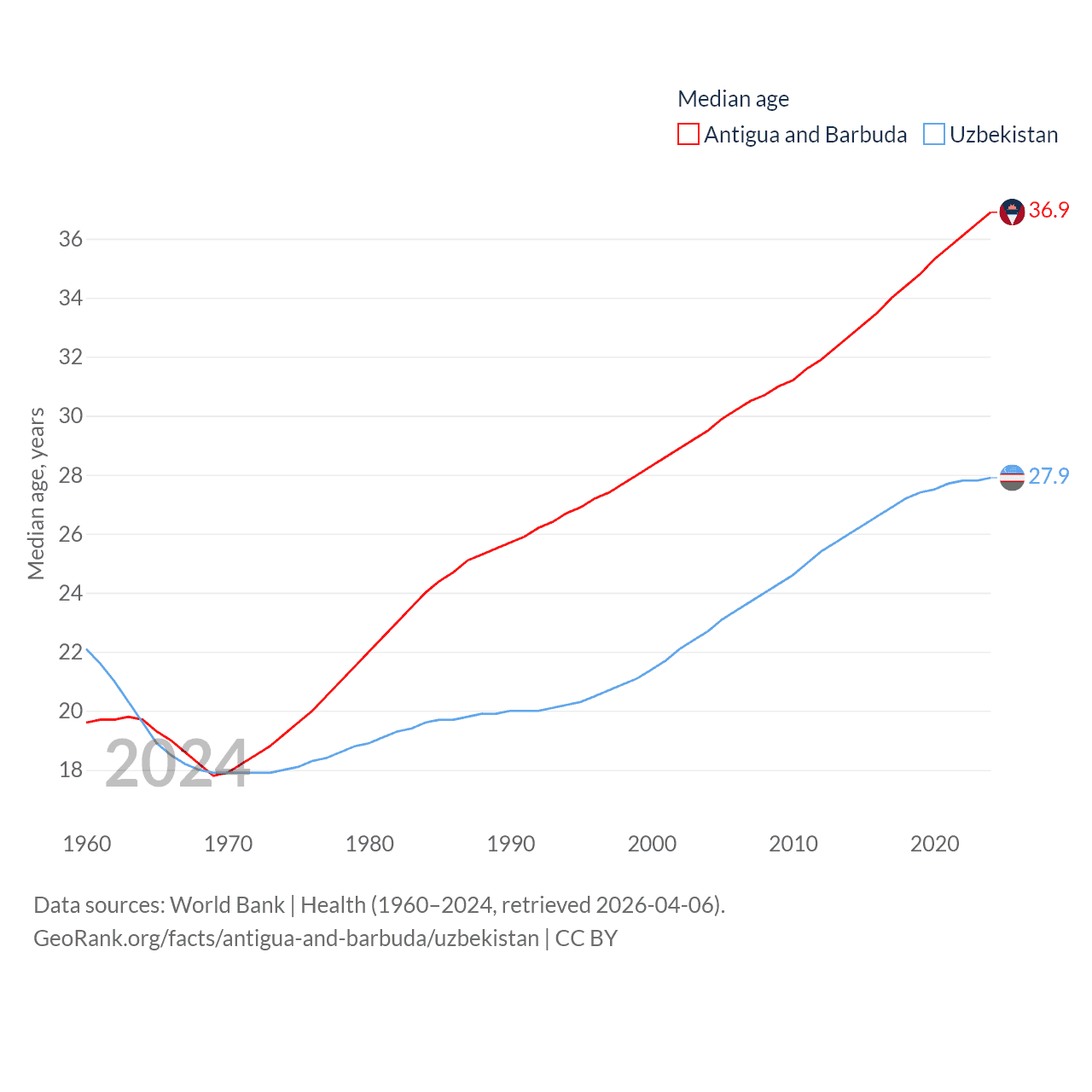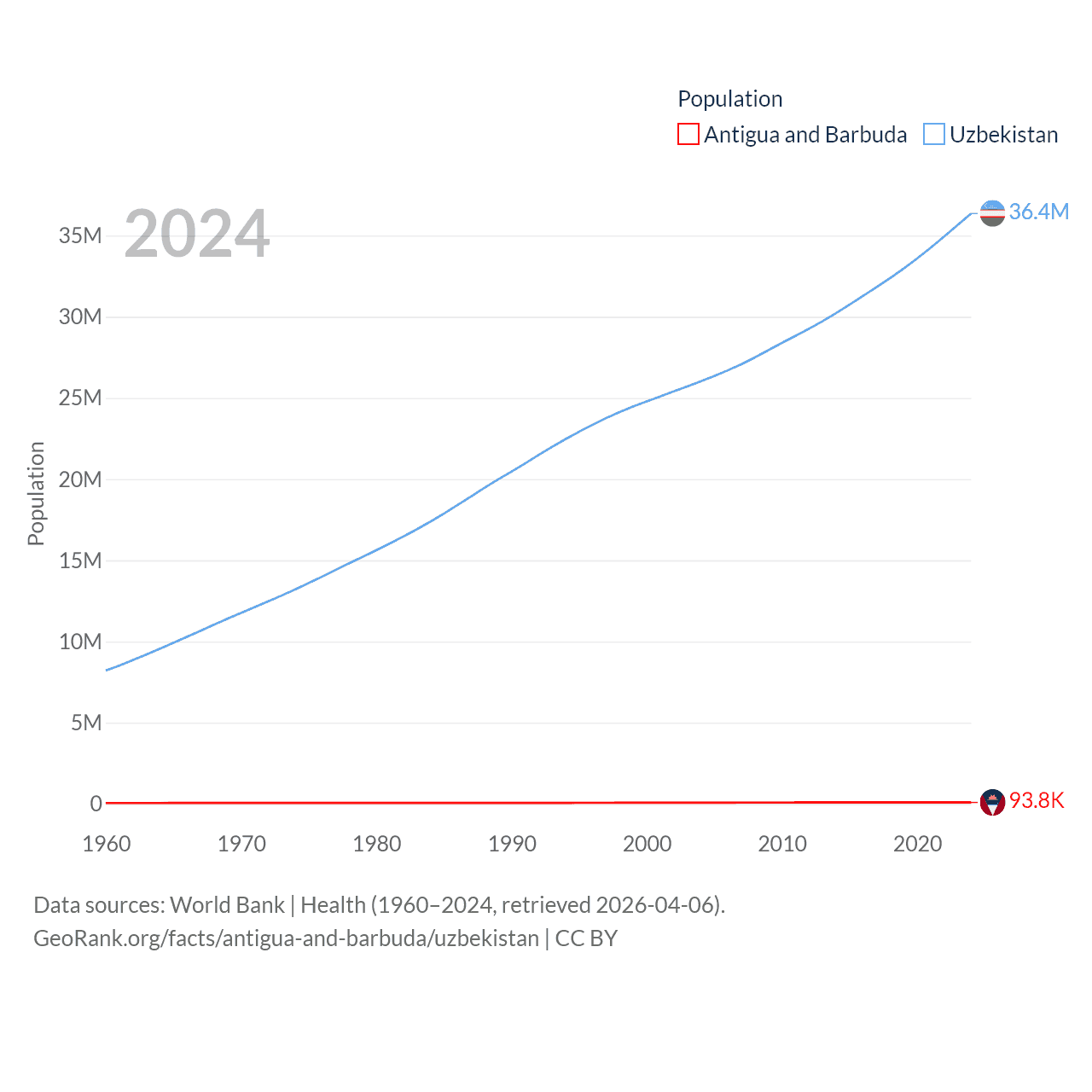 Antigua and Barbuda has a population of 93.8K (ranked 185/197), compared with 36.4M in Uzbekistan (ranked 43/197). Antigua and Barbuda's land area is 169.9 sq mi versus 170,136 sq mi for Uzbekistan (ranked 183rd vs. 56th).