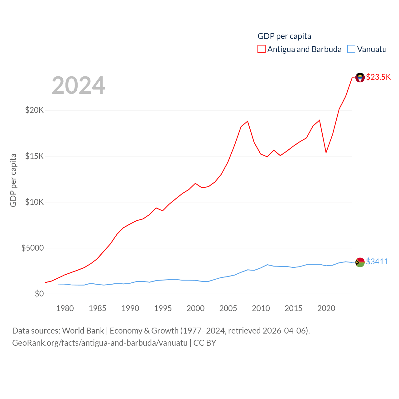 By GDP, Antigua and Barbuda ranks 177/197 ($2.21B) and Vanuatu ranks 188/197 ($1.12B). By GDP per capita, Antigua and Barbuda ranks 53/197 ($23,542), while Vanuatu ranks 137/197 ($3,411).